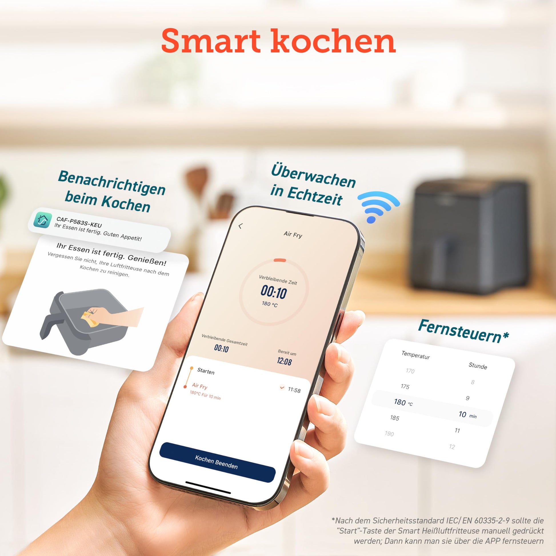 Maximaler Komfort im Alltag: Die intelligente Wi-Fi-Anbindung ermöglicht es Ihnen, das Kochen vom Sofa oder von unterwegs zu managen. Nach dem Essen ist auch die Reinigung ein Kinderspiel: Der entnehmbare, BPA-freie Frittierkorb mit Antihaftbeschichtung ist spülmaschinenfest.