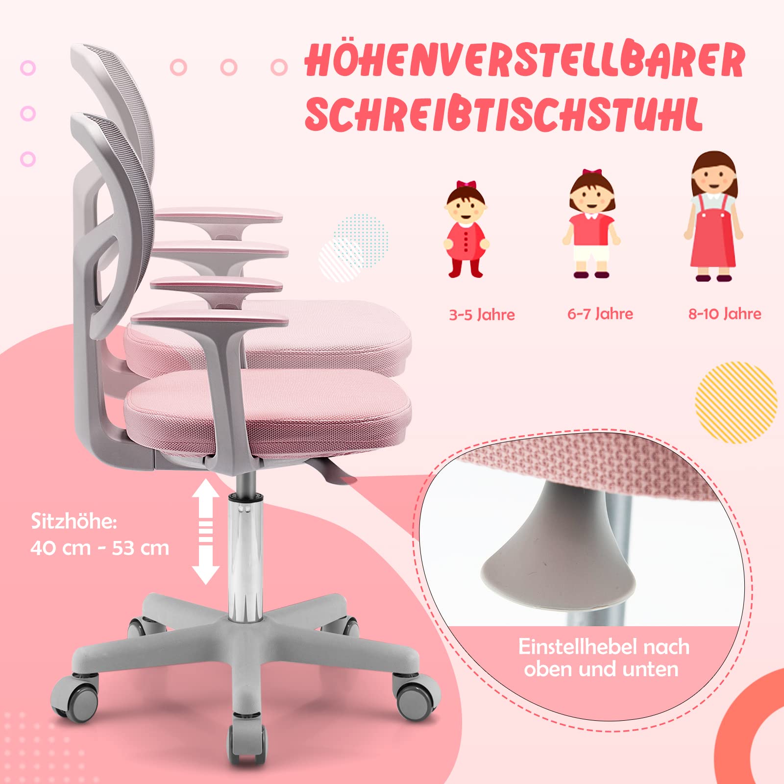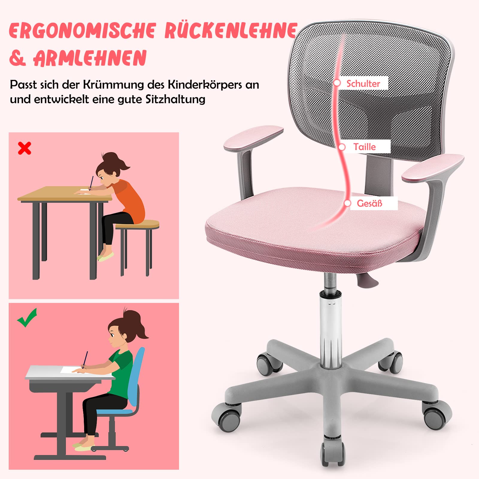 COSTWAY Kinderschreibtischstuhl drehbar mit Rollen - Rosa