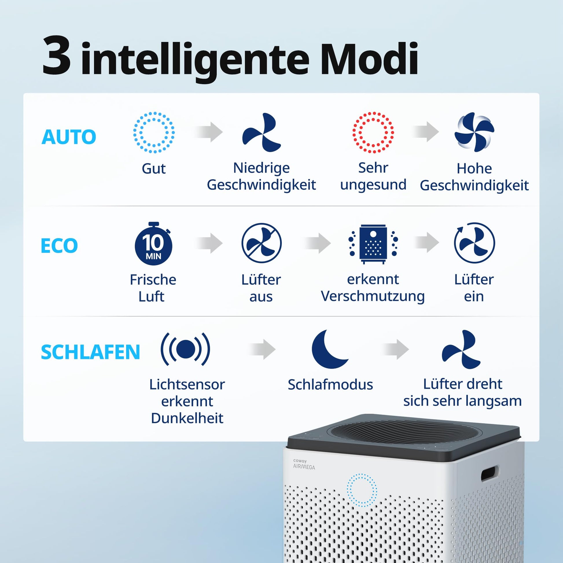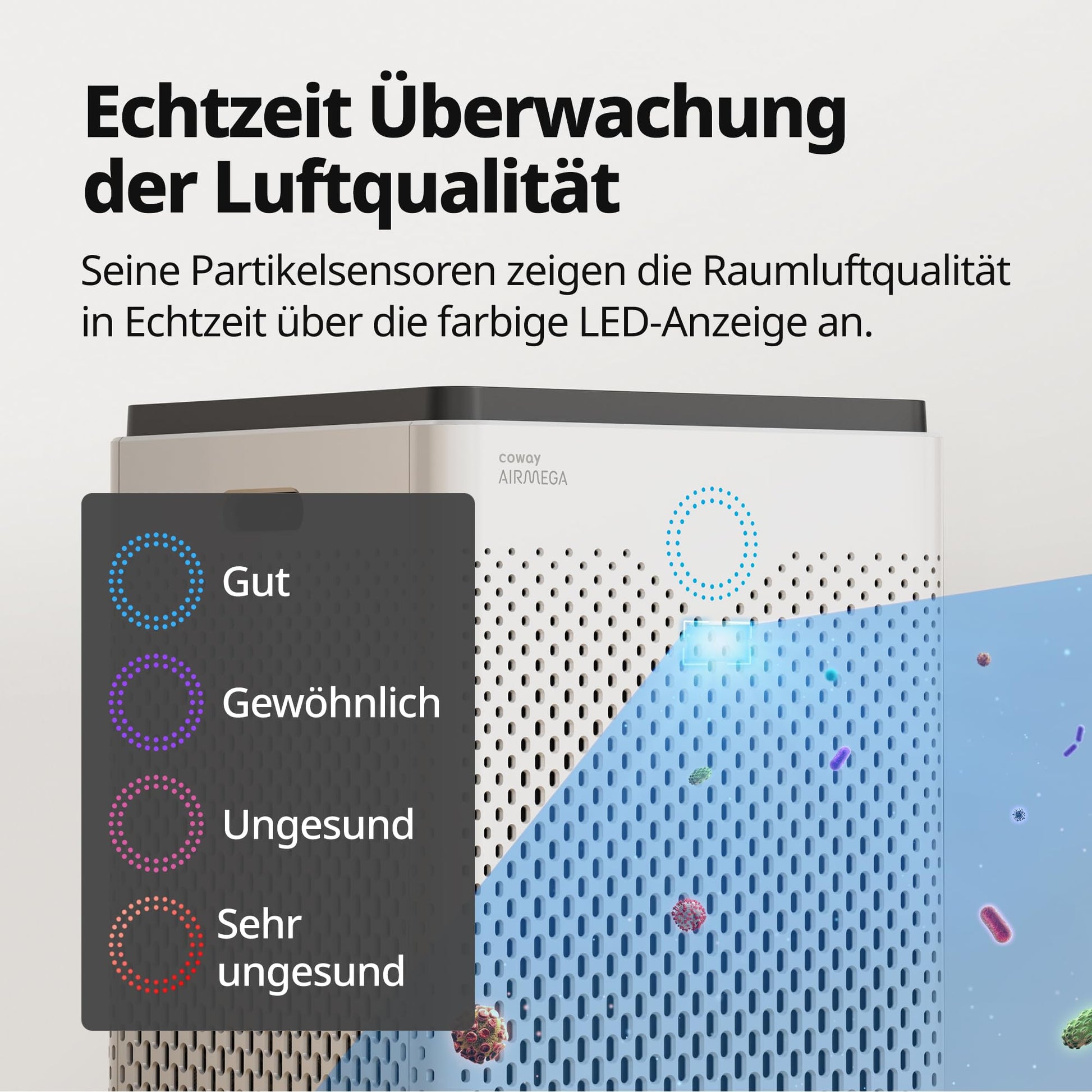 Ja, der COWAY AIRMEGA 300 verfügt über einen intelligenten Automatikmodus. Ein Partikelsensor misst kontinuierlich die Luftqualität in Echtzeit und passt die Lüftergeschwindigkeit automatisch an den aktuellen Bedarf an. Eine farbige LED-Anzeige am Gerät visualisiert dabei stets die Luftreinheit.