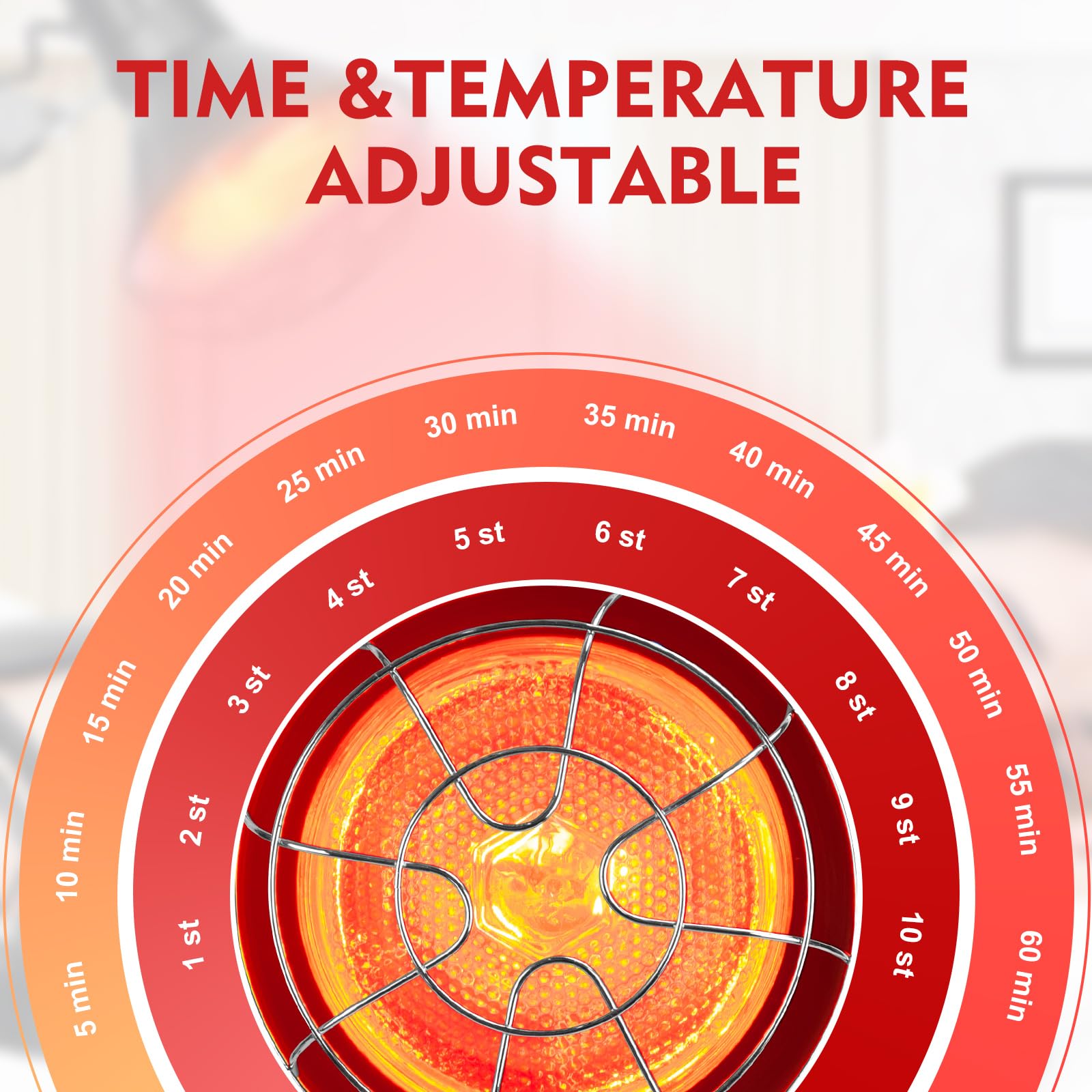 Sie können die Behandlung individuell anpassen. Nutzen Sie den elektronischen Timer, um die Dauer von 5 bis 60 Minuten festzulegen, und regulieren Sie die Intensität über die einstellbare Temperaturregelung. Zusätzlich lässt sich der Lampenkopf flexibel auf die gewünschte Körperstelle ausrichten.