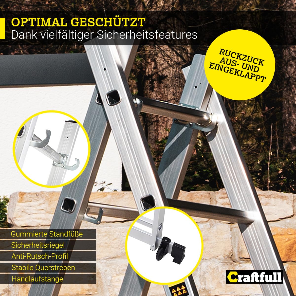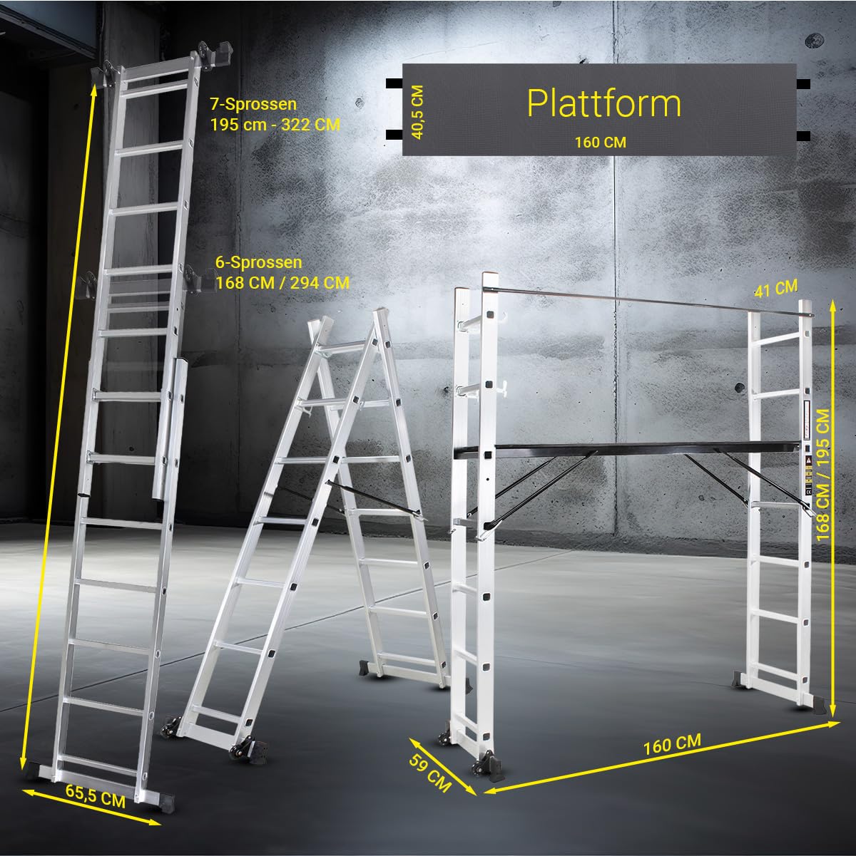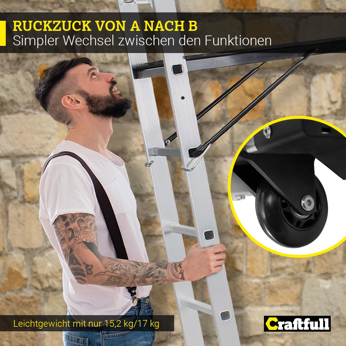 - Flexible 3-in-1-Funktionalität: Dieses Multitalent lässt sich schnell und einfach als Arbeitsbühne, als beidseitig begehbare Bockleiter oder als klassische Anlegeleiter verwenden.