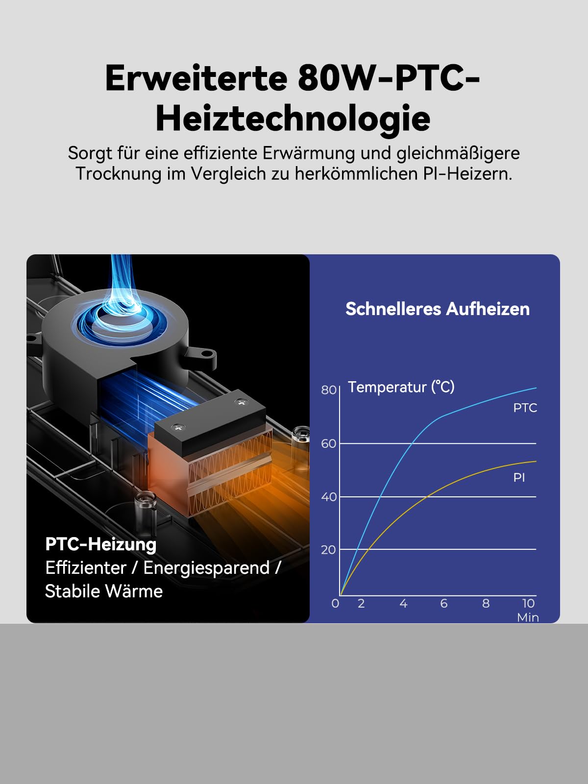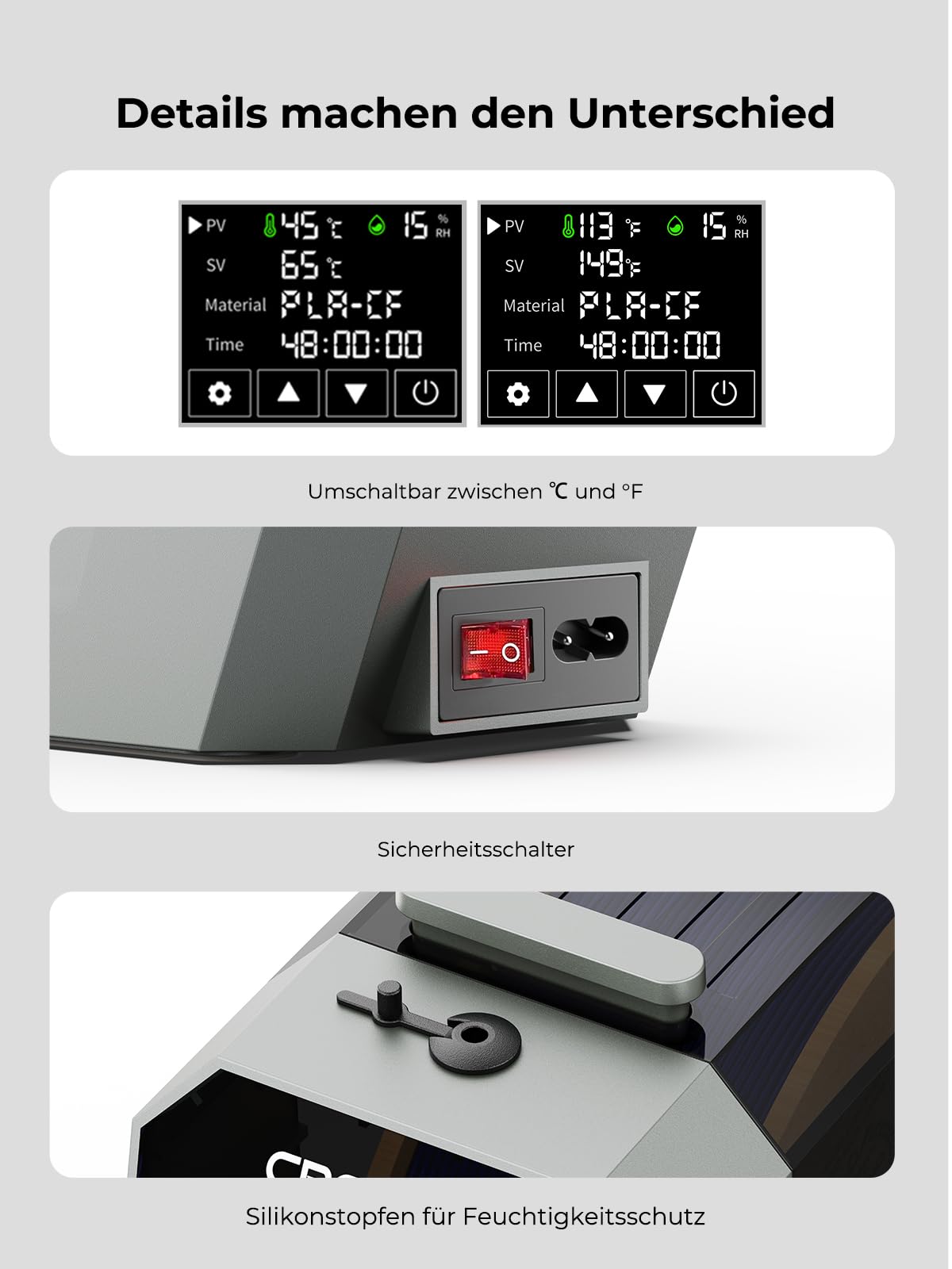 - 360° Umluftheizung: Ein integrierter Ventilator verteilt die Wärme schnell und äusserst gleichmässig, um das Filament von allen Seiten effektiv zu trocknen.