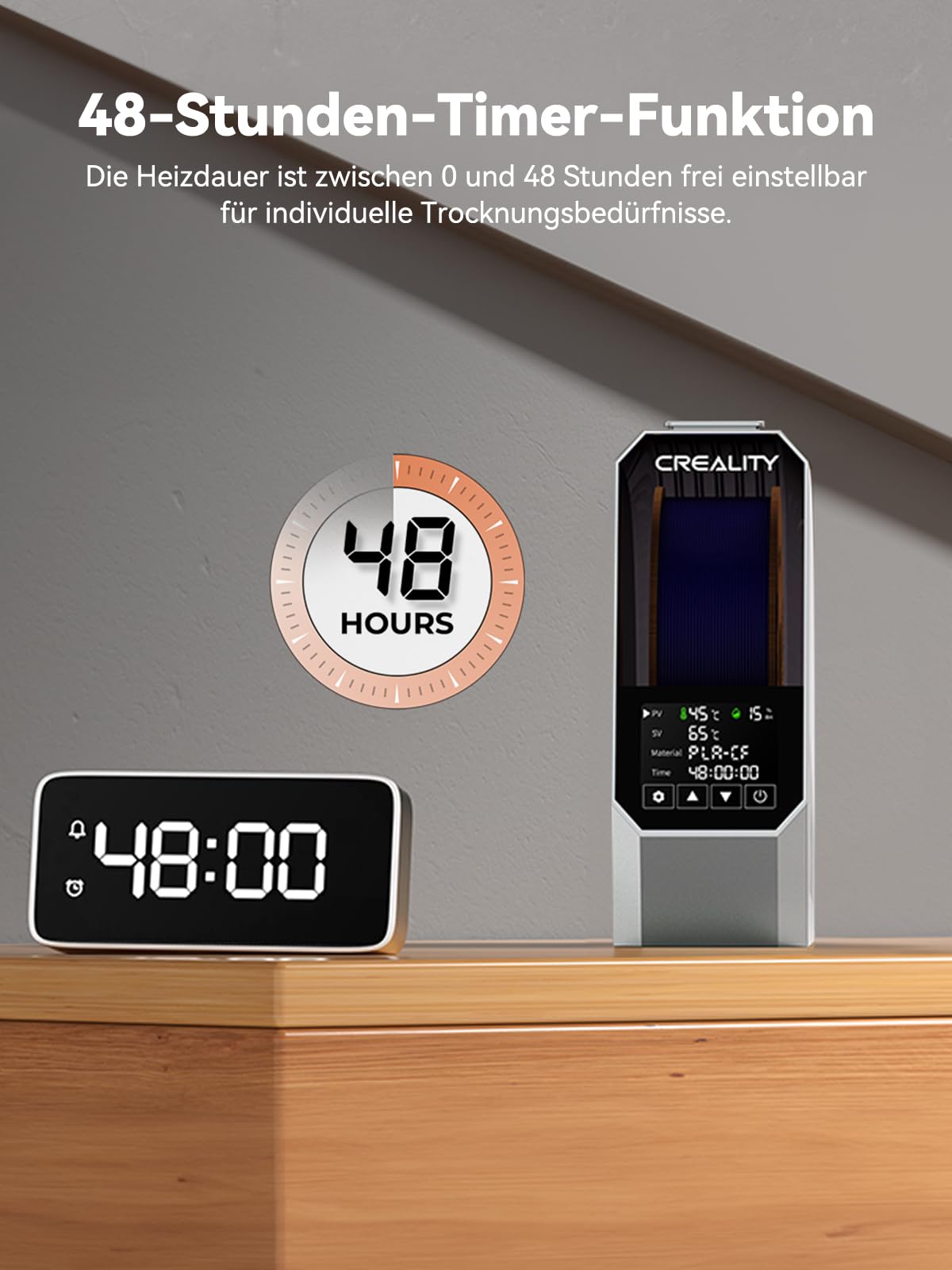 - Flexibler Temperaturbereich: Die Temperatur lässt sich präzise und individuell zwischen 45 °C und 70 °C an die spezifischen Anforderungen Ihres Filaments anpassen.