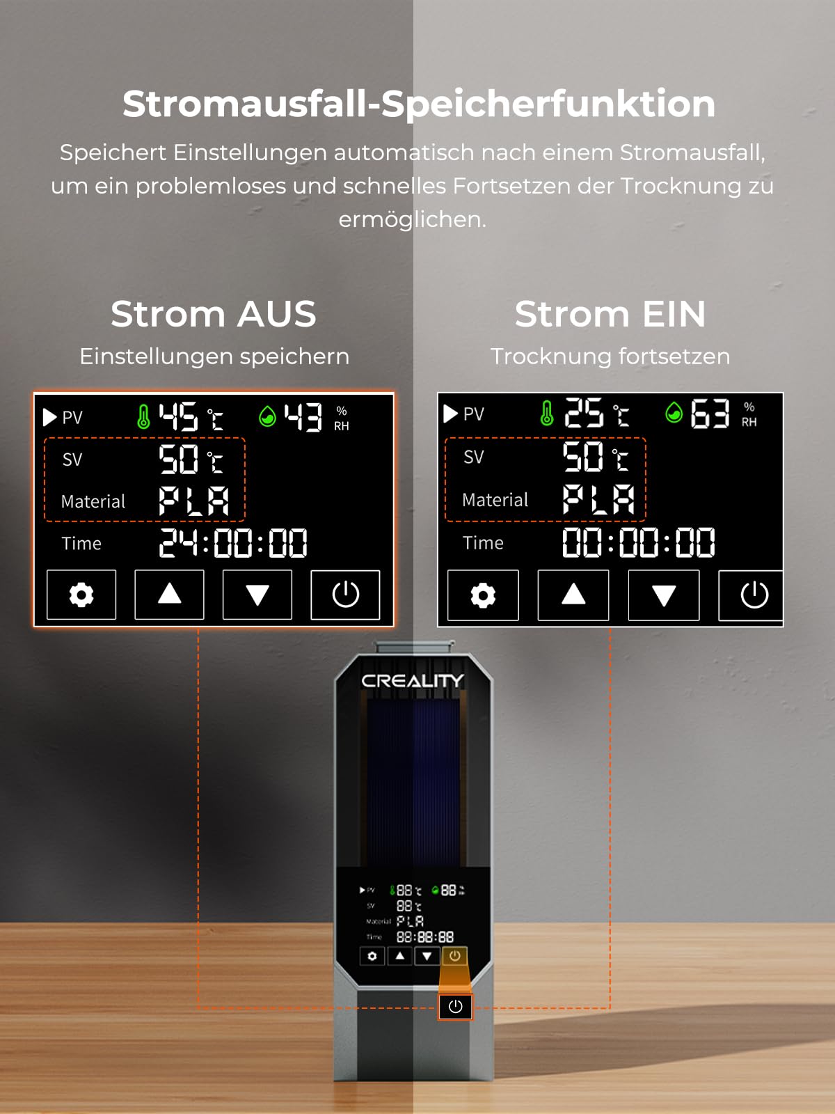 Maximale Druckqualität: Durch die zuverlässige Entfernung von Feuchtigkeit verhindern Sie typische Druckfehler. Das Resultat sind glattere Oberflächen, eine stärkere Layerhaftung und präzisere Details an Ihren Modellen.
