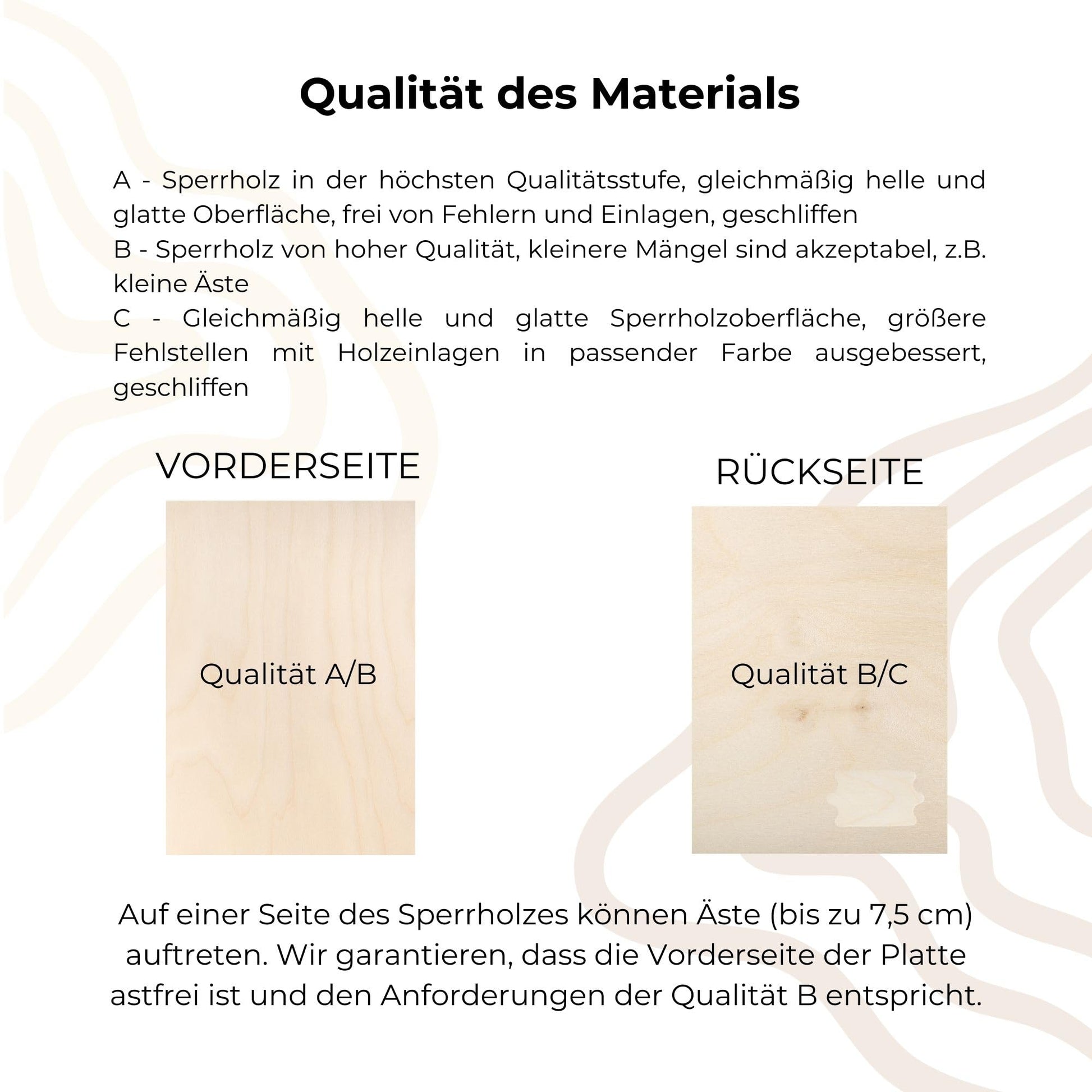 - Qualitätsklasse B/B: Die Holzplatten verfügen über eine glatt geschliffene Oberfläche. Mindestens eine Seite ist garantiert makellos, während die Rückseite kleinere, fachmännisch ausgebesserte Stellen aufweisen kann.