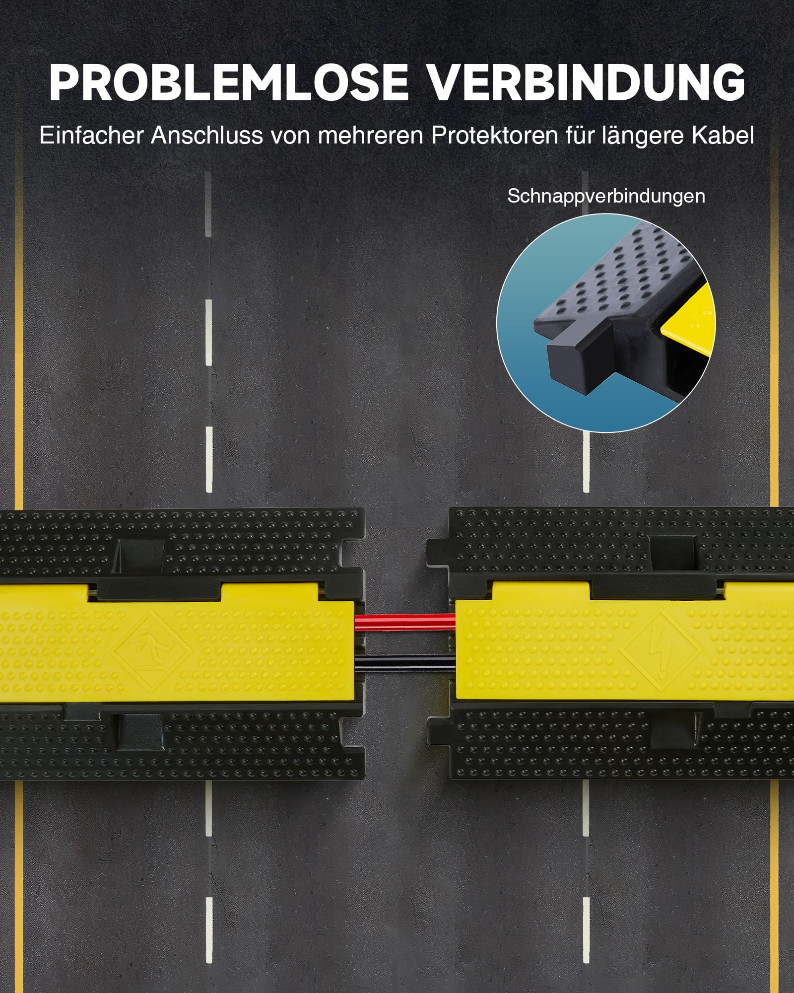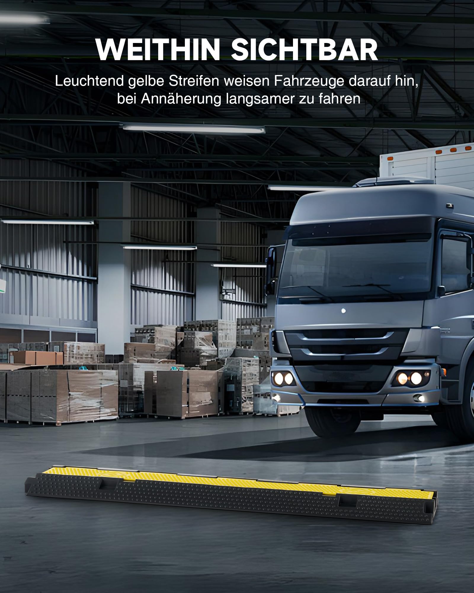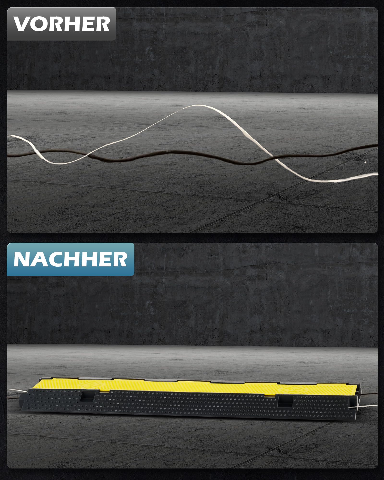 Dieser Kabelschutz ist die ideale Lösung für den temporären oder permanenten Einsatz im Innen- und Aussenbereich. Er eignet sich perfekt für Parkplätze, Lagerhäuser, Werkstätten, Baustellen, Events wie Konzerte oder Märkte, sowie in Schulen oder Einkaufszentren – überall dort, wo Kabel sicher über Bodenflächen geführt werden müssen.