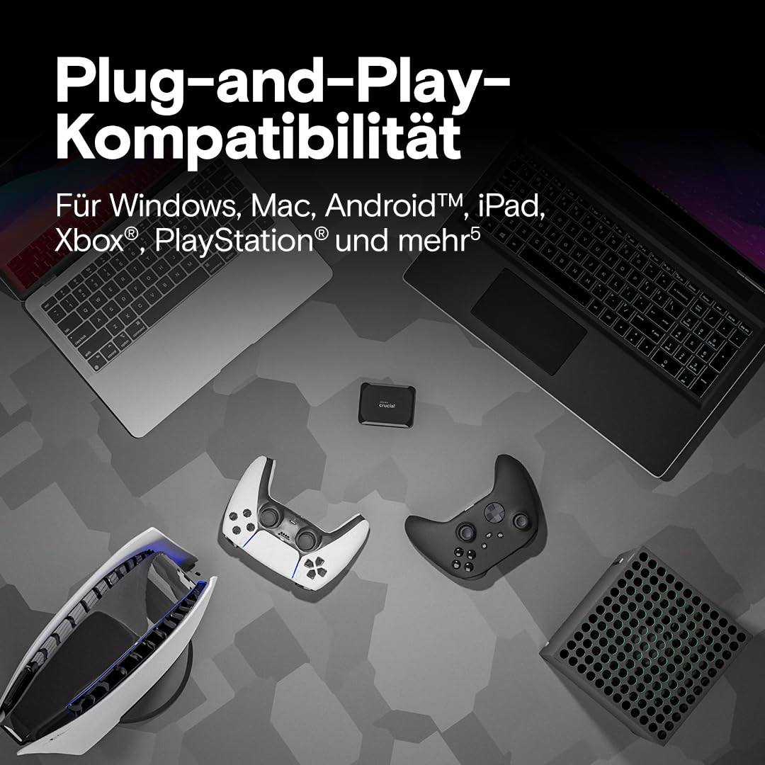 Die SSD ist dank Plug-and-Play und USB-C Anschluss universell einsetzbar. Sie funktioniert sofort mit PCs, Macs, Android-Geräten, Tablets und Spielkonsolen wie der PS5 oder Xbox. Im Lieferumfang ist ein USB-C auf USB-C Kabel enthalten. Für Geräte mit einem klassischen USB-A-Anschluss benötigen Sie einen separaten Adapter.