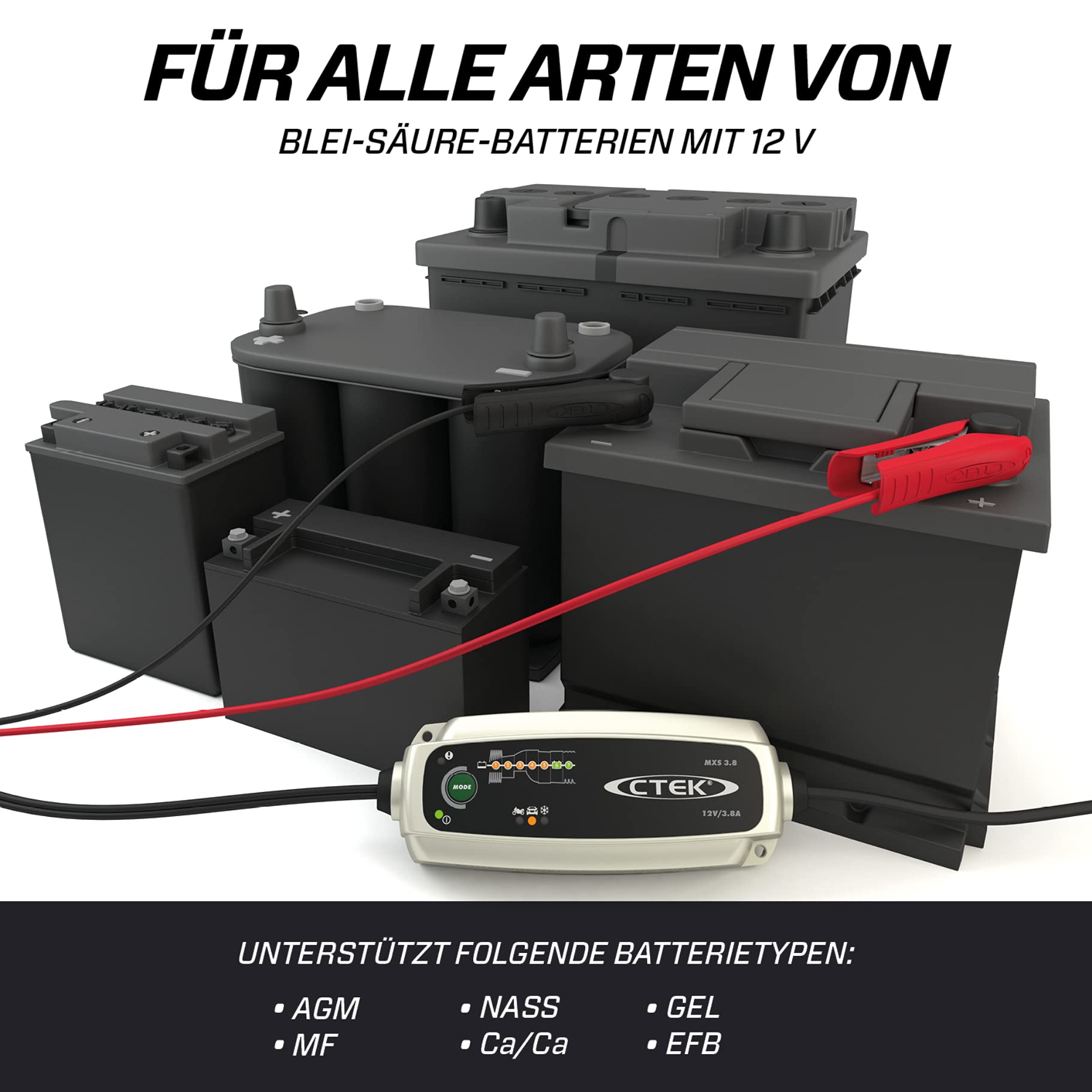 Das MXS 3.8 ist ein vielseitiges 12V-Ladegerät, das für alle gängigen Blei-Säure-Batterietypen (Nass, MF, Ca/Ca, AGM und GEL) mit einer Kapazität von 1,2 Ah bis 85 Ah ausgelegt ist. Es eignet sich somit perfekt für Batterien in Motorrädern, Kleinwagen und den meisten normalen PKWs.