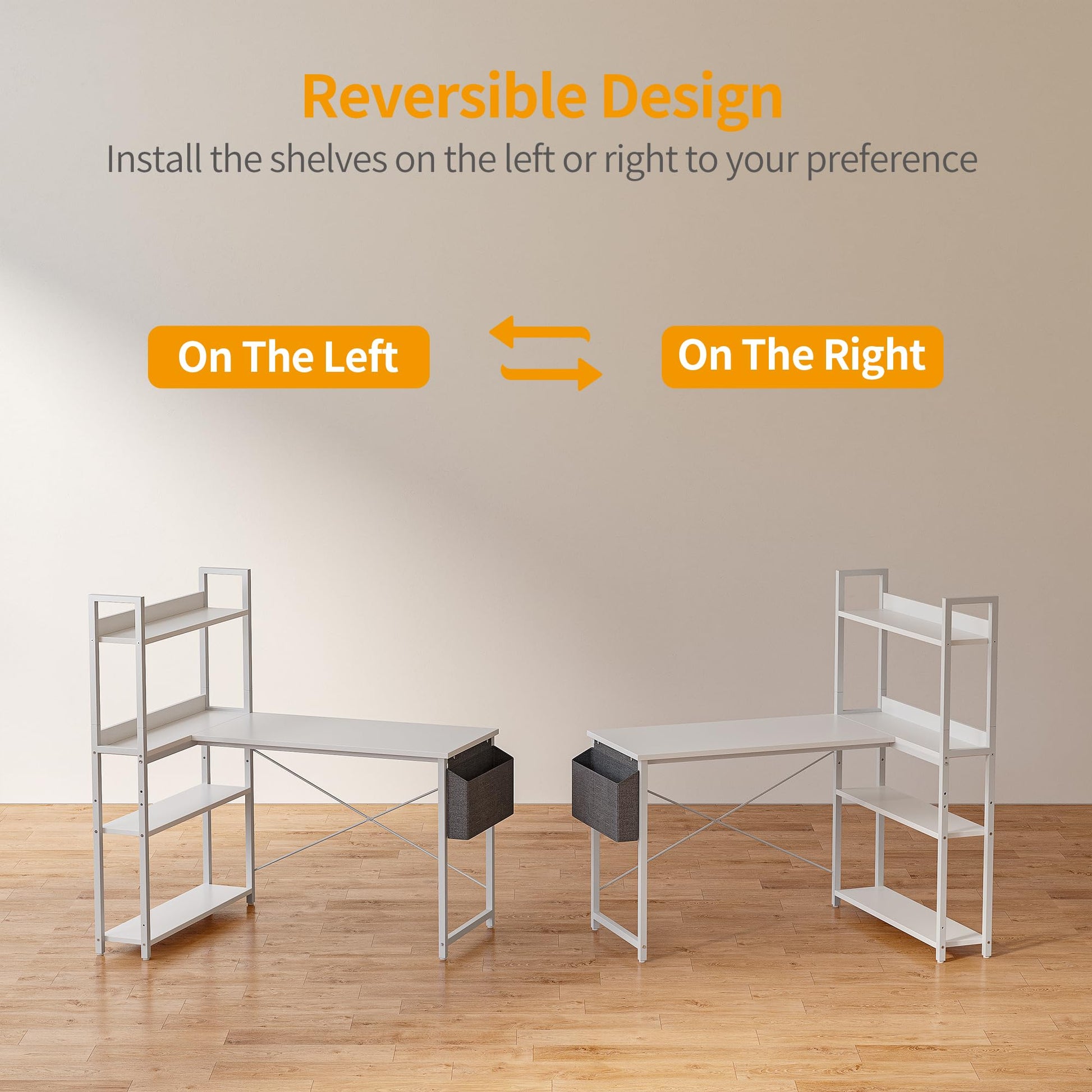 Ja, das Design ist flexibel. Sie können das Regal je nach Raumaufteilung und persönlichen Vorlieben wahlweise auf der linken oder rechten Seite montieren, um Ihren Arbeitsplatz optimal zu gestalten.