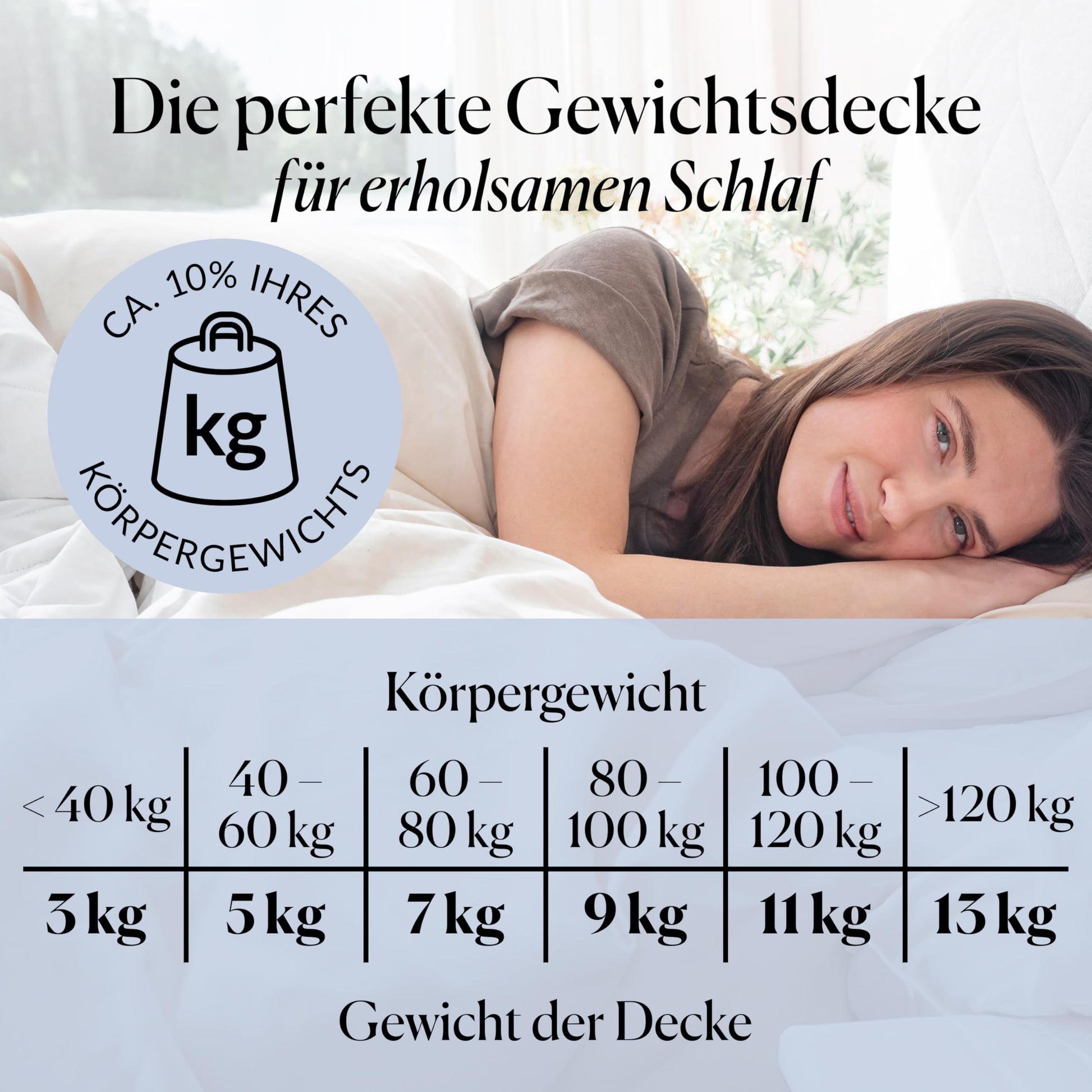 Für eine optimale Wirkung wird ein Deckengewicht empfohlen, das 10 bis 15 % Ihres Körpergewichts entspricht. So wird der ideale Druck für Entspannung und Geborgenheit erzeugt.