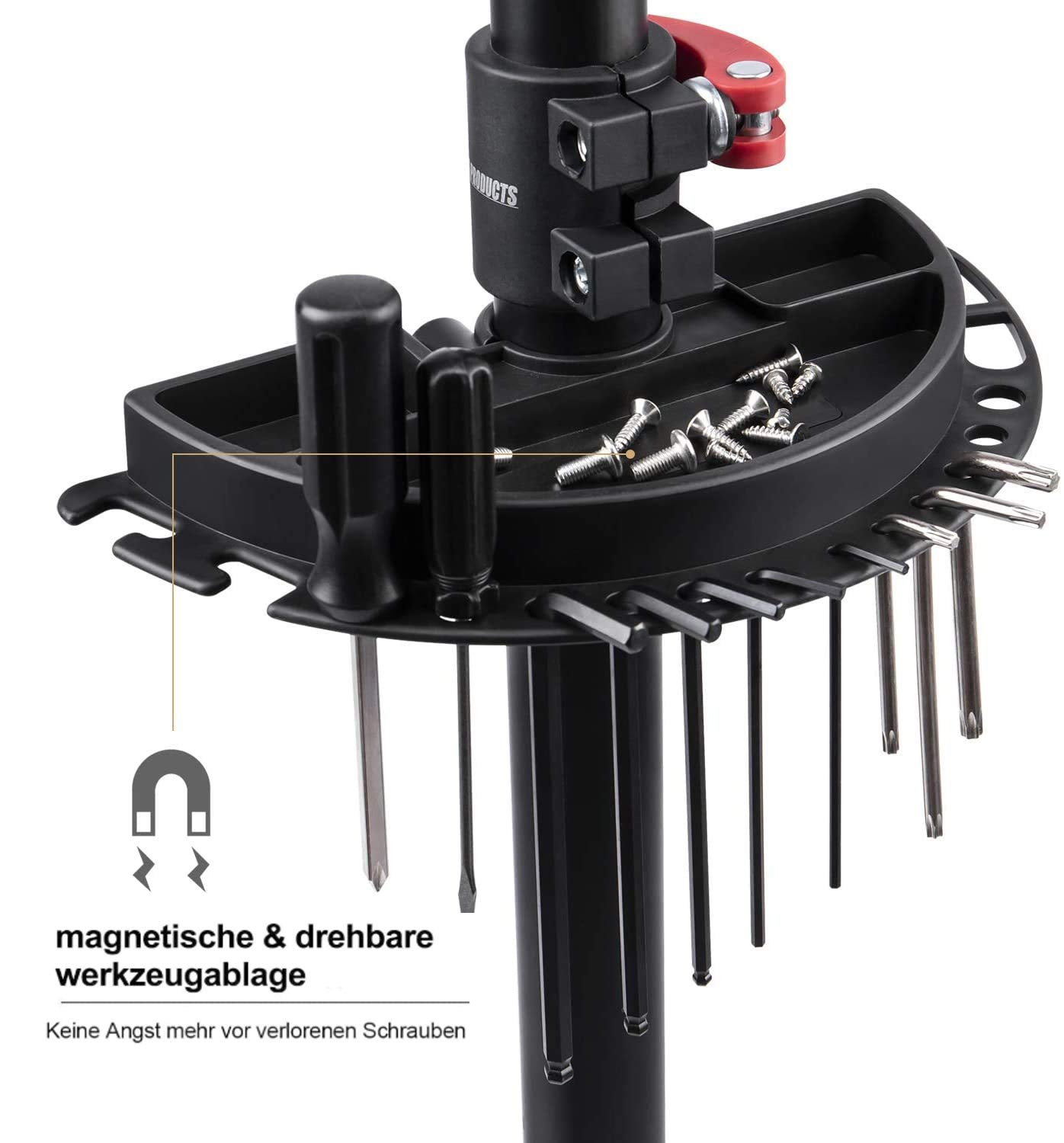 Die mitgelieferte Ablage hält Ihr Werkzeug und Ihre Pflegemittel immer griffbereit. Ein integrierter starker Magnet sorgt zusätzlich dafür, dass Schrauben, Muttern und andere metallische Kleinteile sicher an ihrem Platz bleiben und nicht verloren gehen.