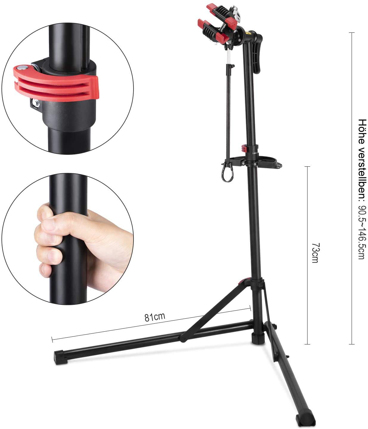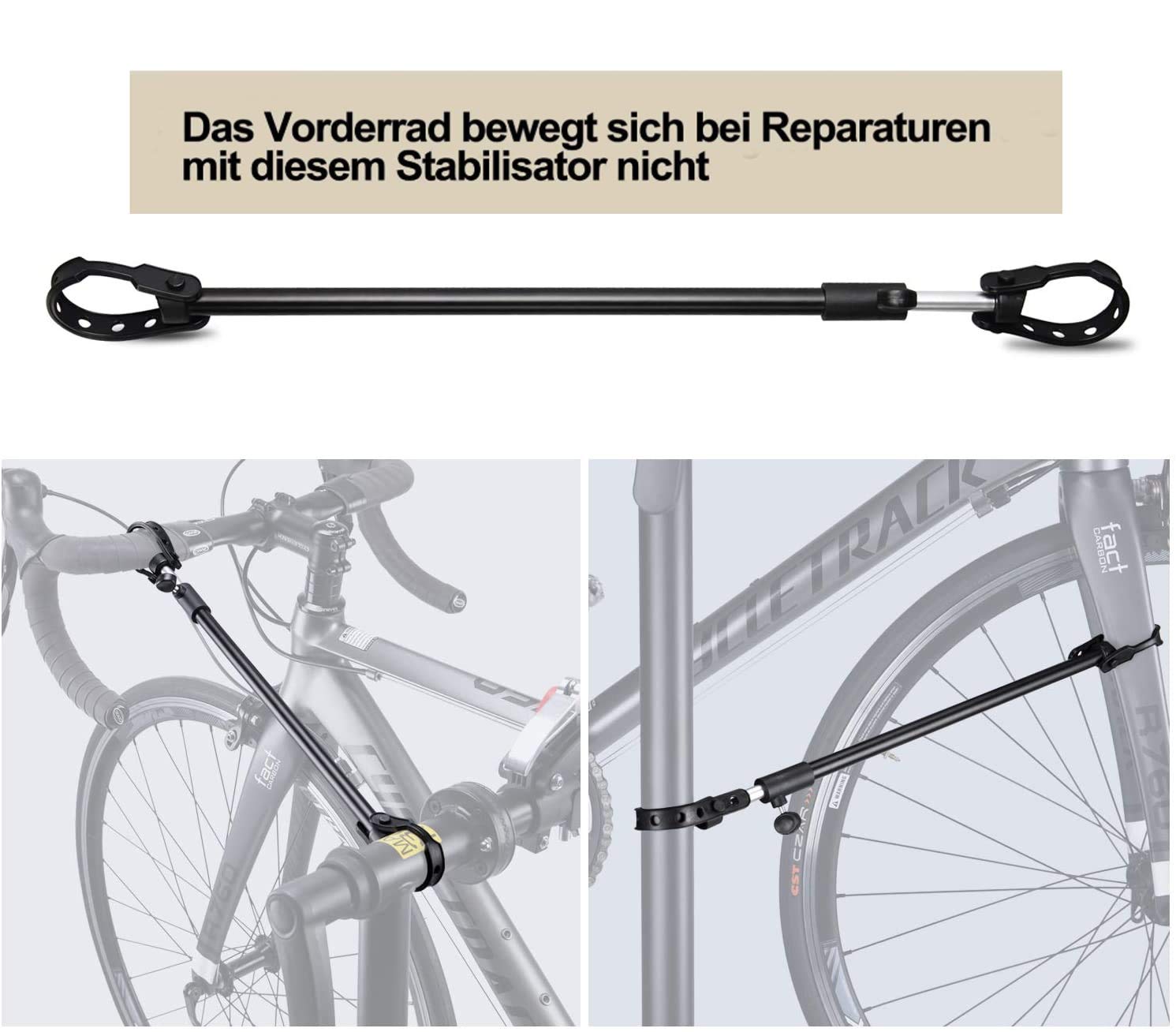Im Lieferumfang ist eine längenverstellbare Haltestange enthalten. Diese wird zwischen Sattel und Lenker gespannt und fixiert so das Vorderrad und den Lenker, damit während der Wartungsarbeiten nichts wackelt oder sich verdreht.