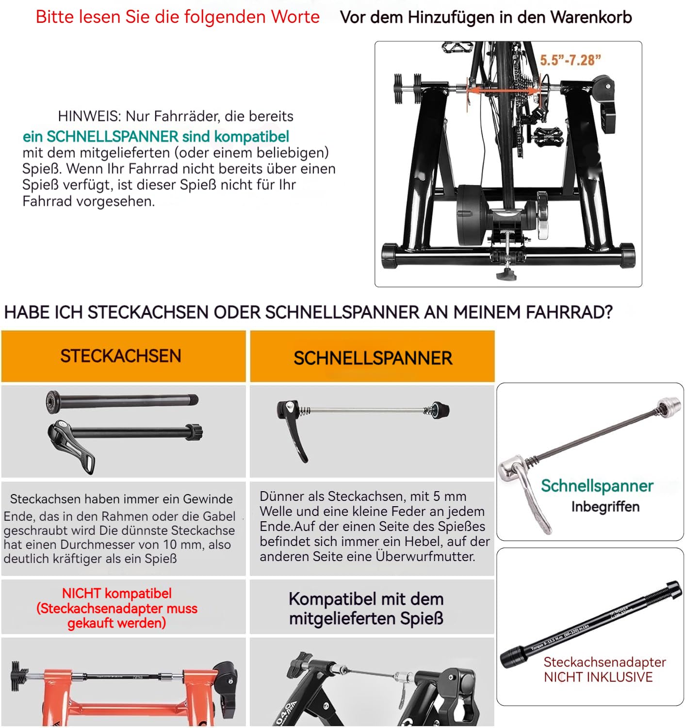Der Rollentrainer ist sehr vielseitig und passt für die meisten Rennvelos und Mountainbikes mit Reifengrössen von 26 bis 29 Zoll sowie 700c. Er ist sowohl für Fahrräder mit Schnellspanner- als auch mit Schraubachsen konzipiert.