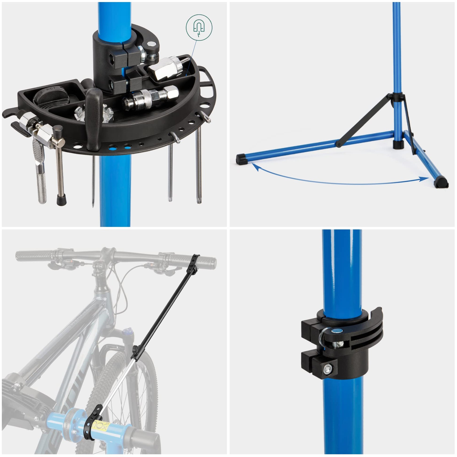 Effizienz und Ordnung gehen Hand in Hand. Die praktische, magnetische Werkzeugablage hält alle benötigten Utensilien genau dort, wo Sie sie brauchen. Gleichzeitig verhindert die Haltestange das lästige Pendeln des Vorderrads, sodass Sie sich voll und ganz auf die Reparatur konzentrieren können.
