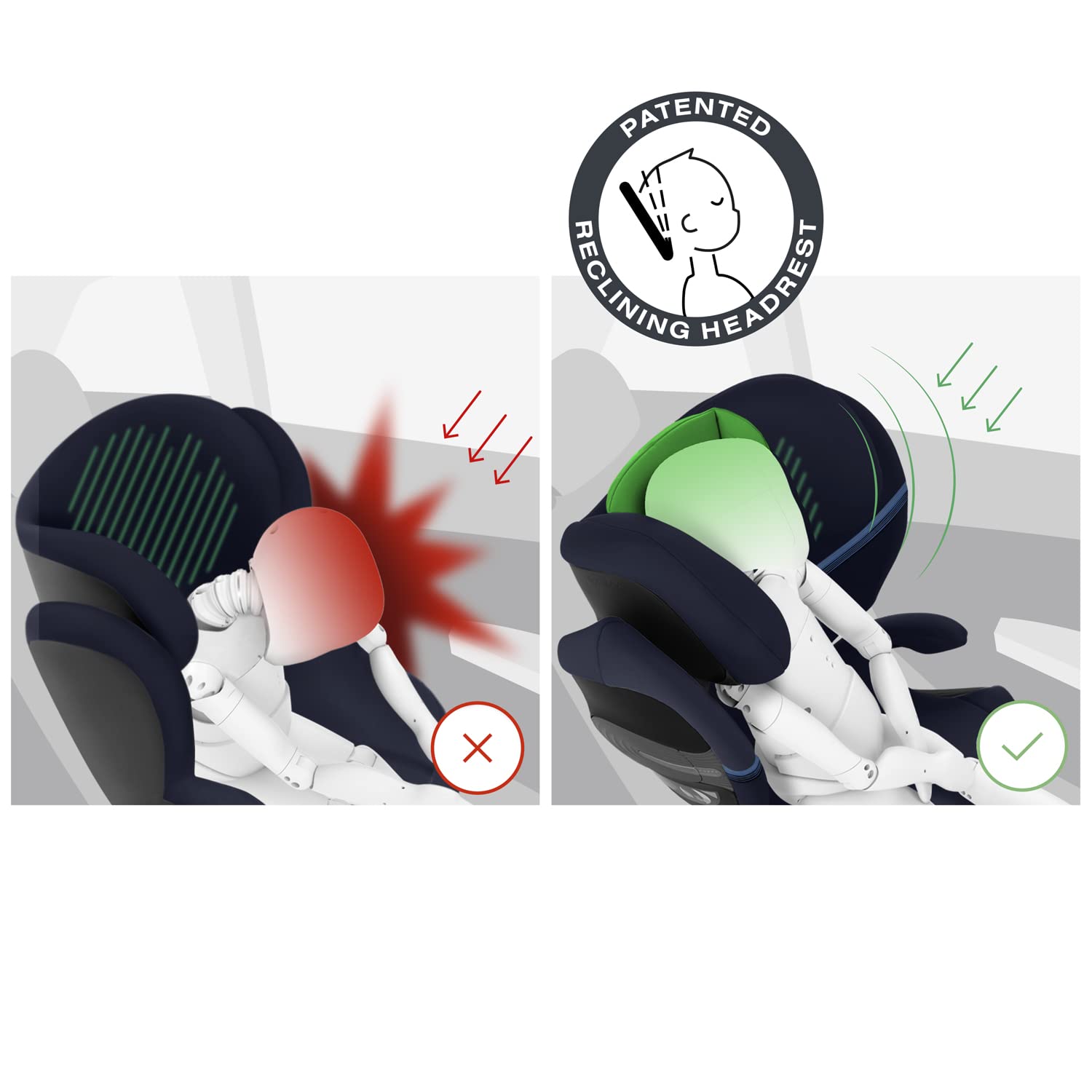- Patentierte Kopfstütze: Die 3-fach neigungsverstellbare Kopfstütze verhindert, dass der Kopf des Kindes im Schlaf nach vorne kippt und hält ihn in der Sicherheitszone.