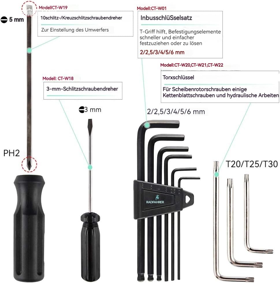 - Umfassendes Set: Beinhaltet 23 essenzielle Werkzeuge, darunter einen Kettennieter, Pedalschlüssel, eine Kettenpeitsche und viele weitere Tools für die Velo-Wartung.