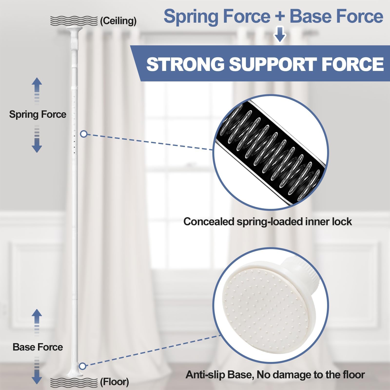 Die Befestigung erfolgt komplett ohne Bohren und Schrauben durch eine clevere Spanntechnik zwischen Boden und Decke. Es hinterlässt keinerlei Löcher oder Spuren und ist daher die ideale, schadenfreie Lösung für Mietwohnungen und empfindliche Oberflächen.