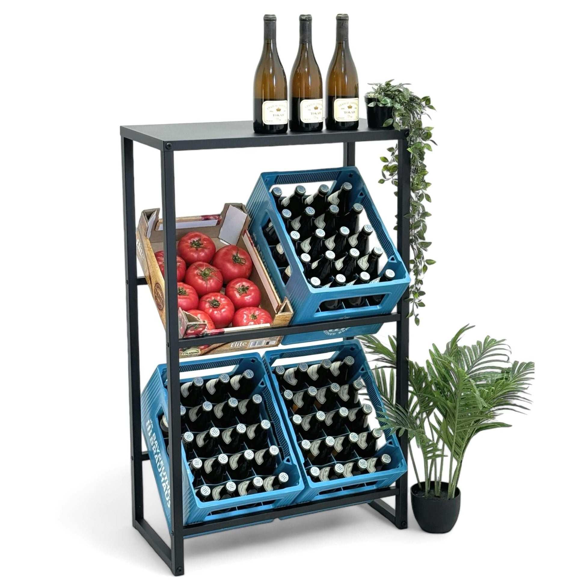 Das Regal bietet stabilen Platz für bis zu vier handelsübliche Getränkekisten. Es ist ideal für gängige Bier-, Wasser- oder Limonadenkisten und sorgt für eine übersichtliche Lagerung.
