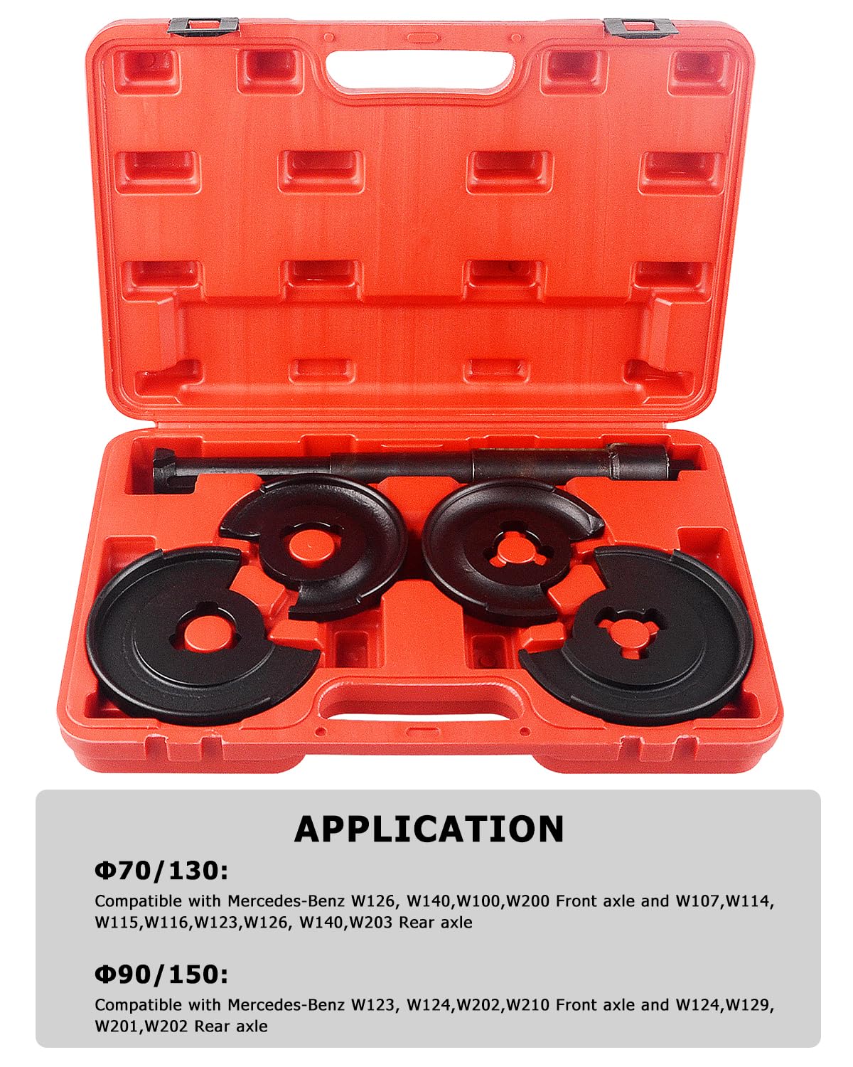 Das Set ist dank zweier Druckplatten extrem vielseitig. Es ist speziell für eine breite Palette von Mercedes-Benz-Modellen wie W123, W124, W126, W140, W201, W202, W203 und W210 konzipiert. Darüber hinaus ist es auch für ausgewählte Fahrzeuge von GM, Opel, Peugeot, Rover, Hyundai, Saab, Volvo, VW, Fiat, Mazda, Nissan und Mitsubishi geeignet.