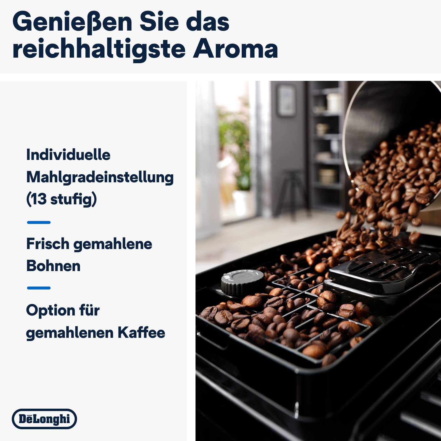 - Frische auf Abruf: Das integrierte, 13-stufige Kegelmahlwerk mahlt die Bohnen aus dem 250-g-Behälter für jede Tasse frisch. Der Automat kann alternativ auch mit Kaffeepulver betrieben werden.