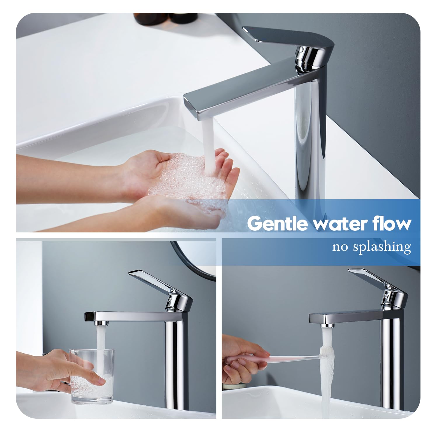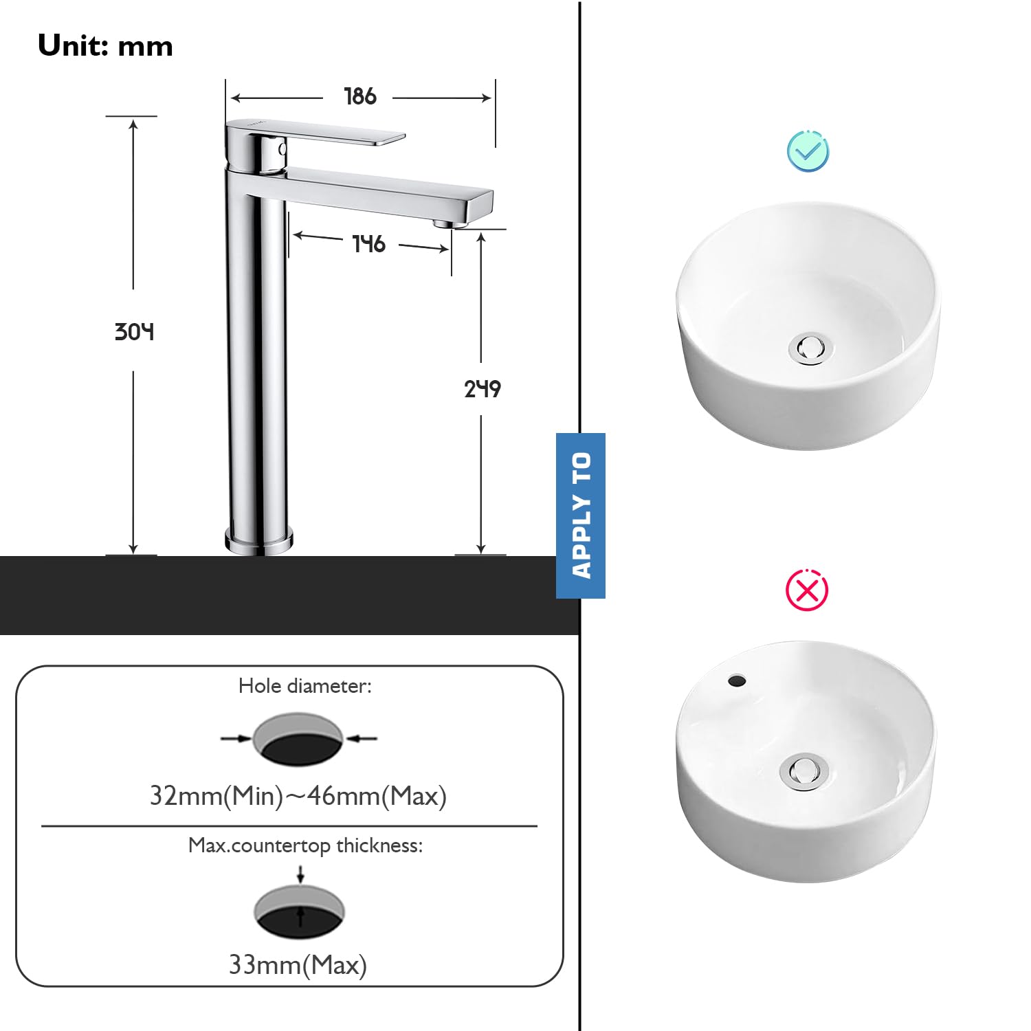 - Ideale Höhe für Aufsatzbecken: Mit einer Gesamthöhe von rund 304 mm und einer Auslaufhöhe von 250 mm passt diese Armatur perfekt zu Waschschalen und Aufsatzwaschbecken.