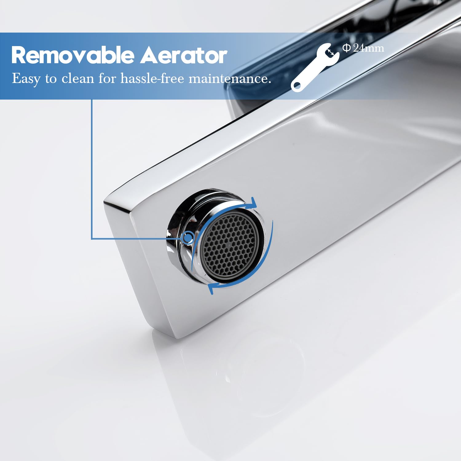 - Abnehmbarer Luftsprudler: Der eingebaute Strahlregler sorgt für einen gleichmässigen, weichen und spritzfreien Wasserfluss. Er kann zur einfachen Reinigung mit einem 24-mm-Schlüssel entfernt werden.