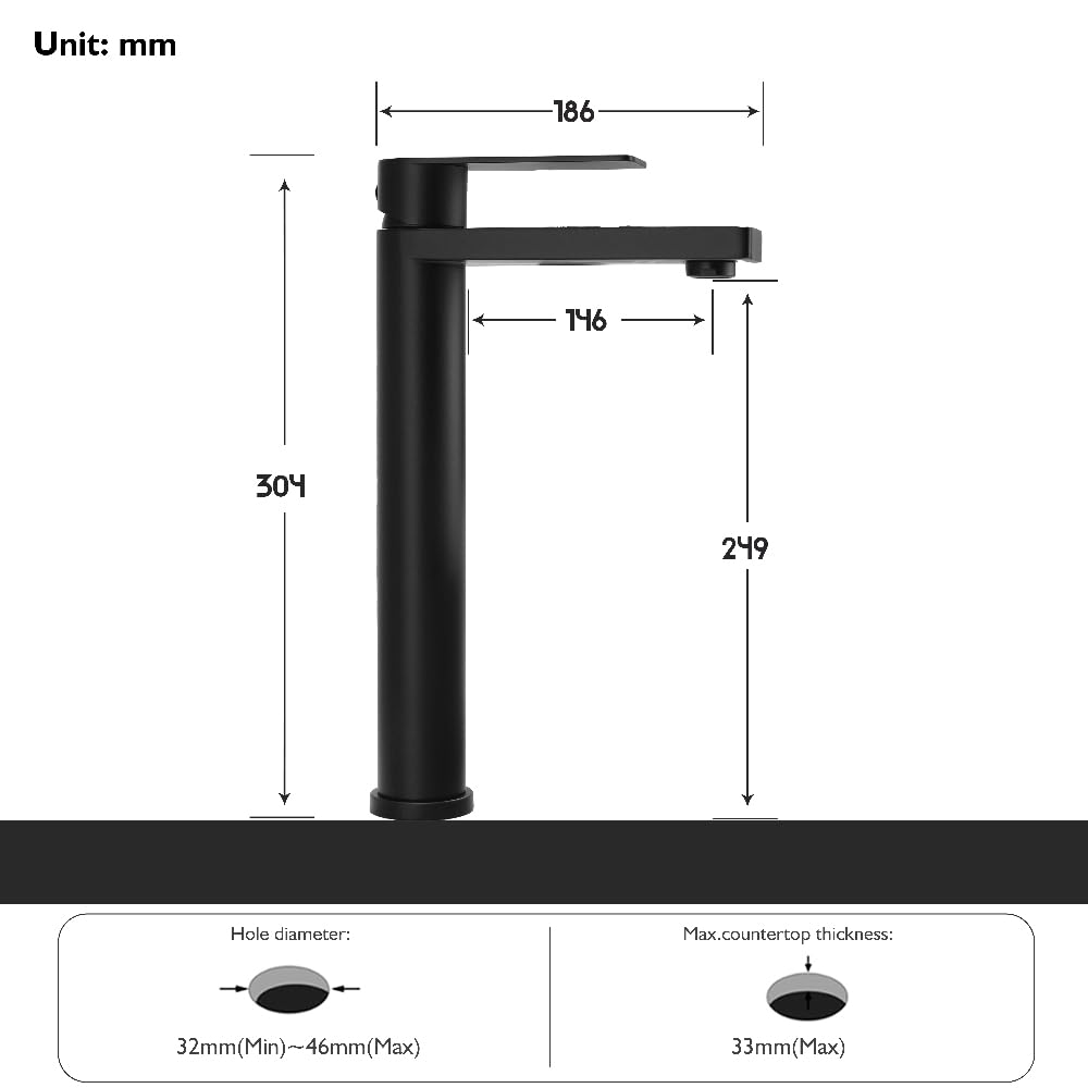 - Bauhöhe: Mit einer Gesamthöhe von ca. 304 mm und einer Auslaufhöhe von 250 mm perfekt für Waschschalen ohne Hahnloch konzipiert.