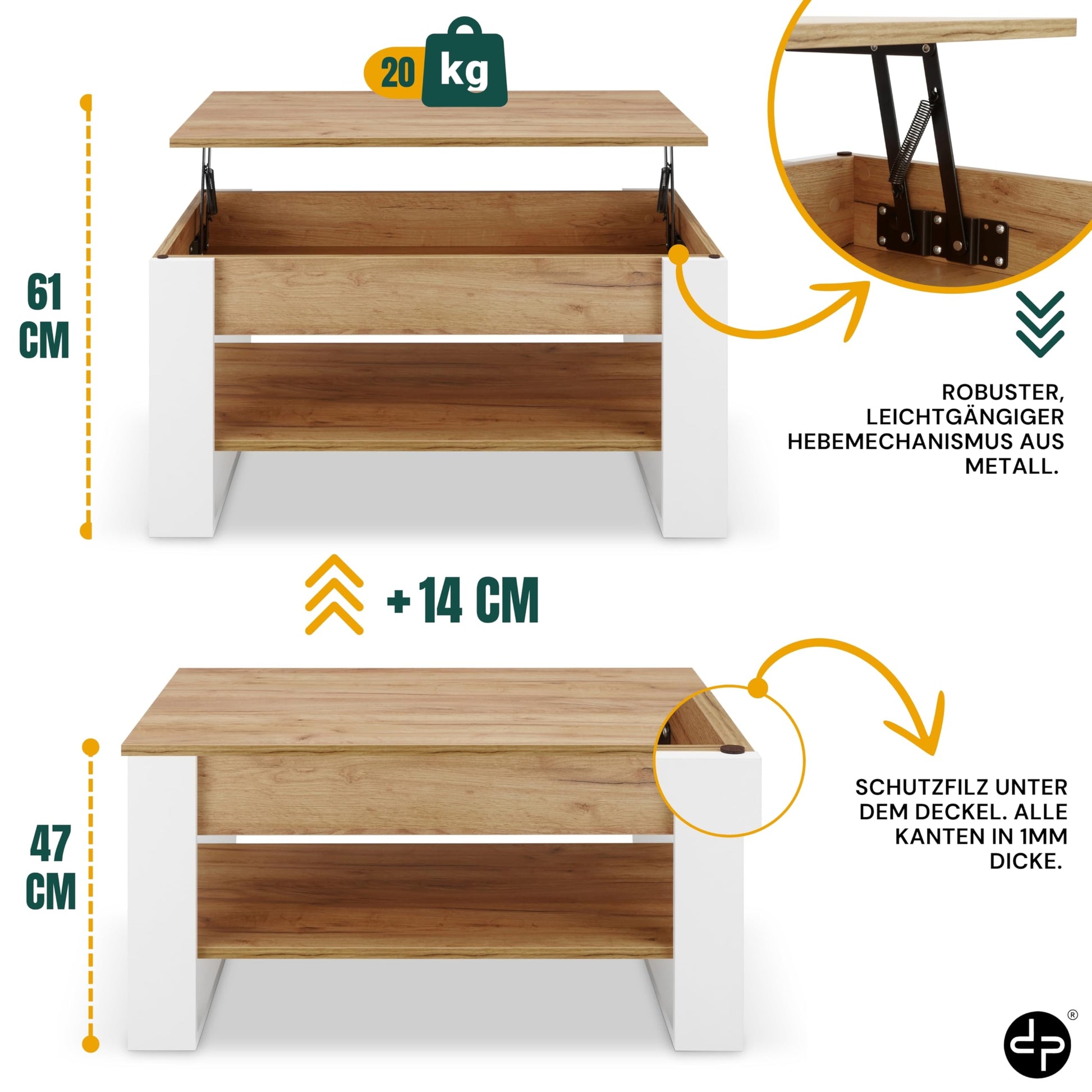 - Durchdachter Stauraum: Der Tisch bietet eine grosszügige untere Ablage (85 x 45 cm) sowie ein diskretes, verstärktes Fach unter der anhebbaren Tischplatte für Alltagsgegenstände.