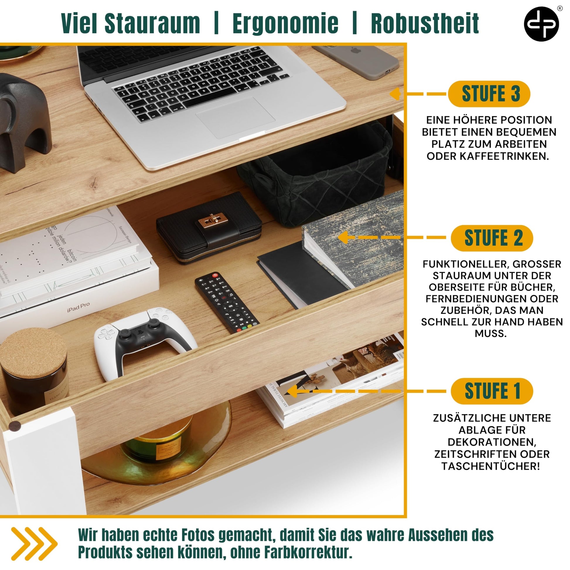 defiPad Höhenverstellbarer Ausziehbarer Couchtisch - Weiss Eiche