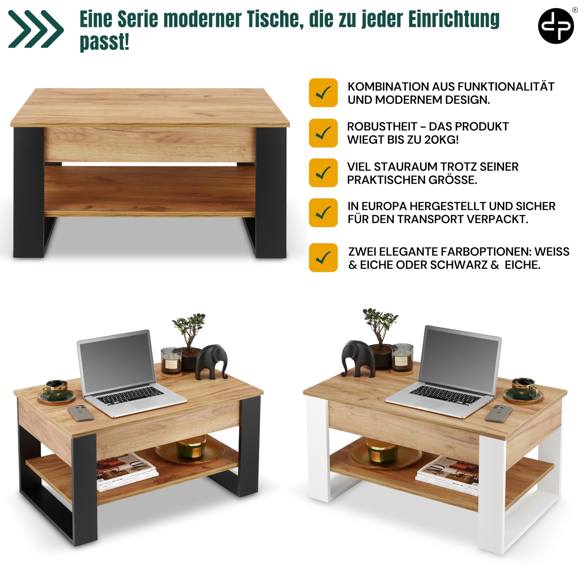 defiPad Couchtisch Höhenverstellbar mit Stauraum – Schwarz/Eiche