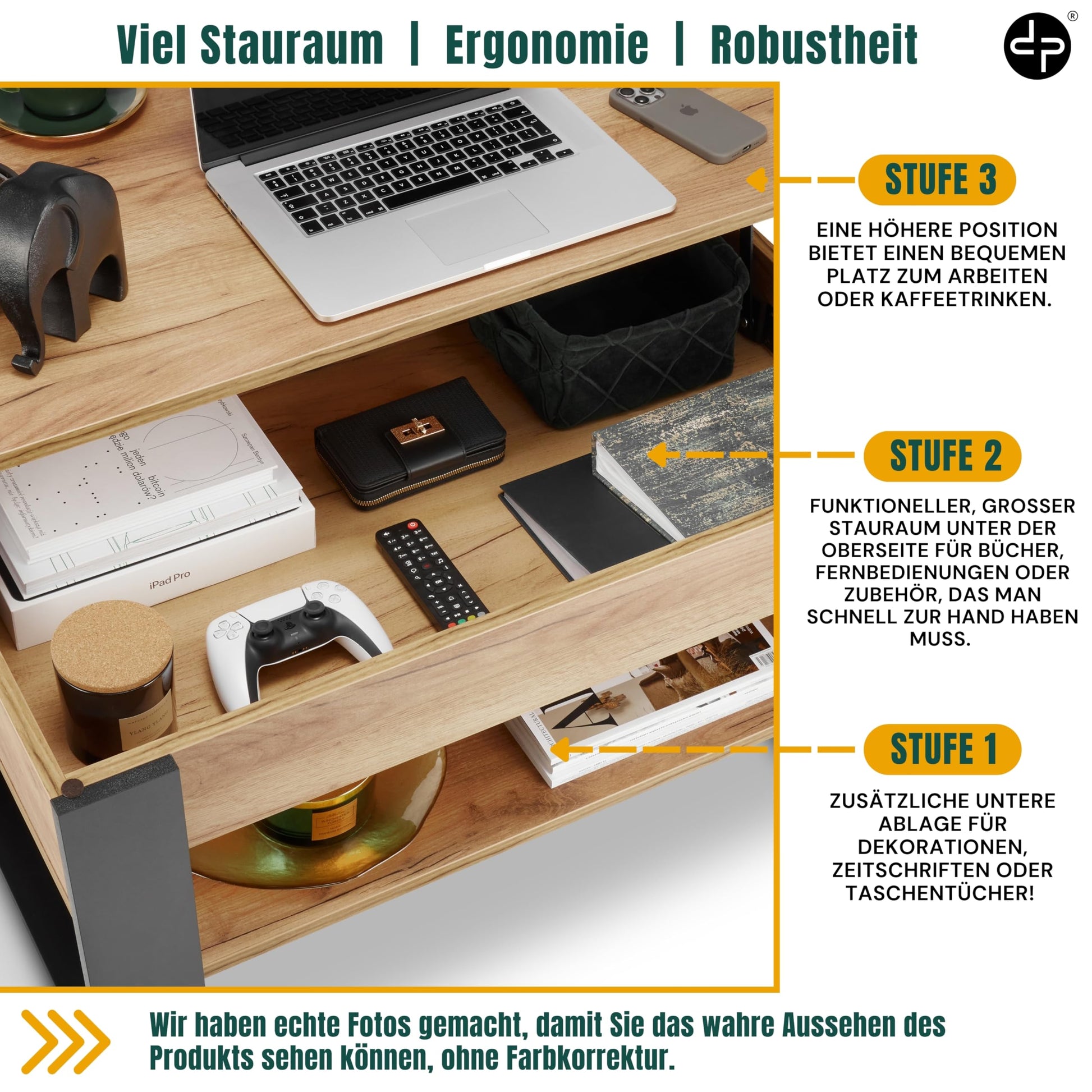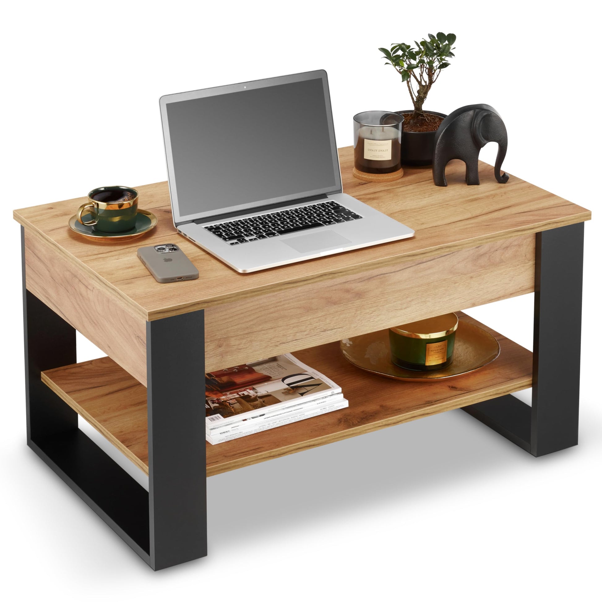 - Durchdachter Stauraum: Bietet eine grosszügige untere Ablagefläche (85 x 45 cm) sowie ein verborgenes Fach unter der anhebbaren Tischplatte, um Alltagsgegenstände ordentlich zu verstauen.
