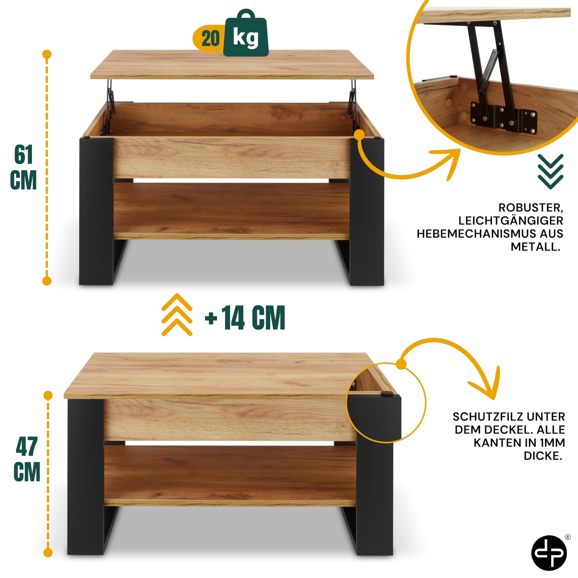 Der Tisch verfügt über ein cleveres Stauraumkonzept. Er bietet eine grosse, offene Ablagefläche (85 x 45 cm) für Zeitschriften oder Deko sowie ein geräumiges, verborgenes Fach unter der anhebbaren Tischplatte, um Fernbedienungen und andere Alltagsgegenstände ordentlich zu verstauen.