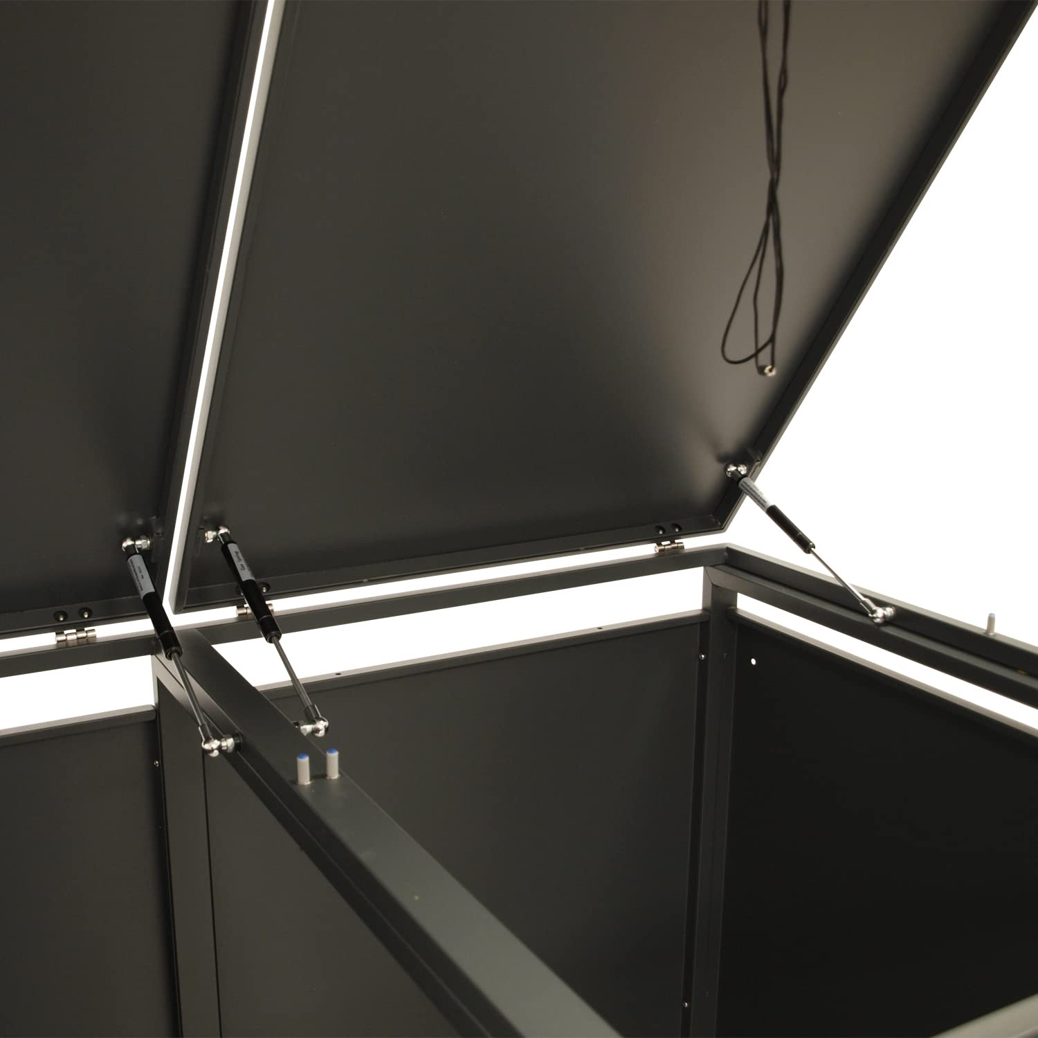Die Verkleidung ist aus robustem, verzinktem Stahl gefertigt und mit einer widerstandsfähigen Pulverbeschichtung im Farbton Anthrazit veredelt. Diese Kombination bietet optimalen Schutz vor Witterungseinflüssen, ist langlebig und sehr pflegeleicht.