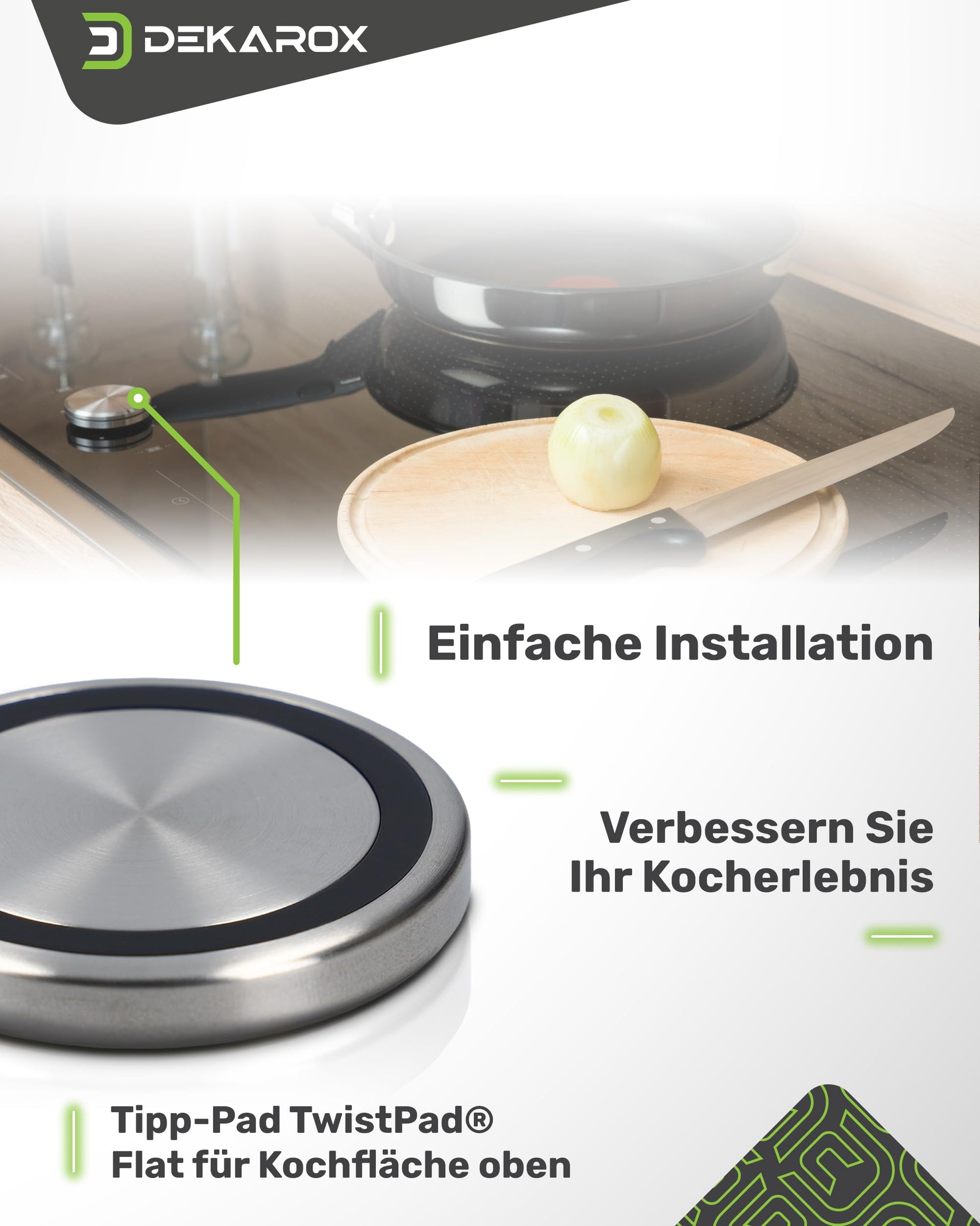- Elegantes Design: Mit seiner flachen, silbrigen Form fügt sich der Knopf nahtlos in das Design moderner Glaskeramik- und Induktionskochfelder ein.