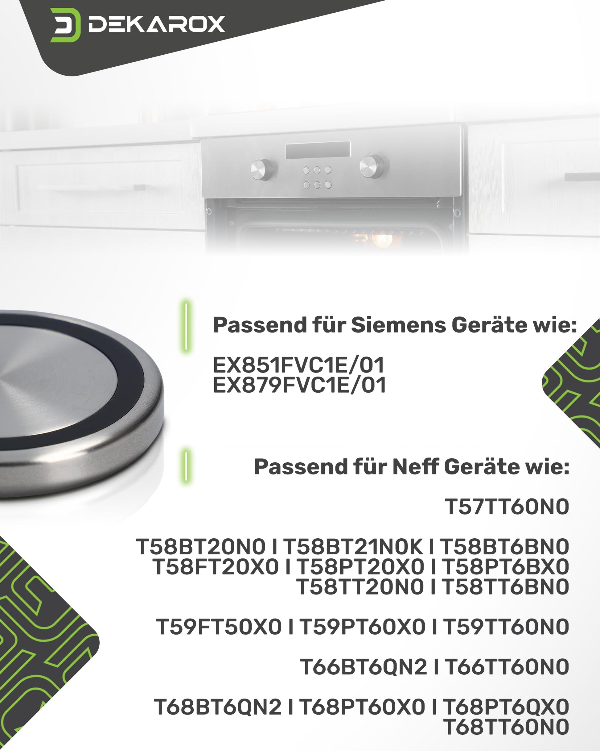 Dieser Drehknopf ist ein passgenauer Ersatz für den originalen TwistPad-Knopf diverser Kochfelder der Marken Bosch, Balay, Constructa, Siemens und Neff. Er ersetzt die Originalteilenummer Neff 10004928 (sowie 00636170). Eine detaillierte Liste kompatibler Neff- und Siemens-Modelle finden Sie in der Produktbeschreibung.