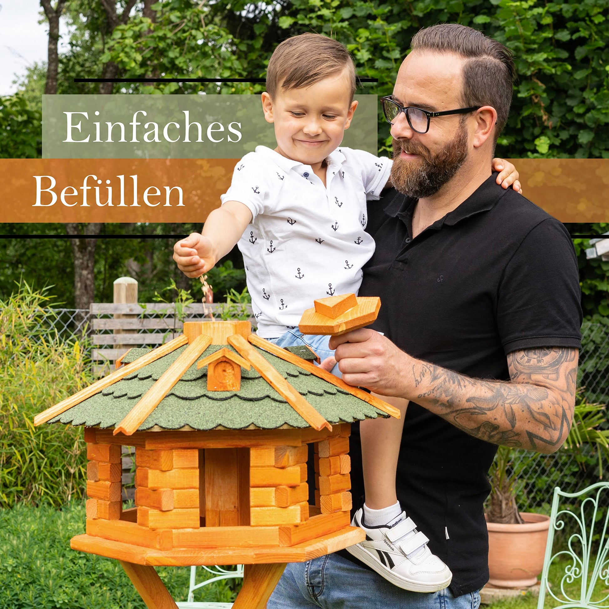 Das Nachfüllen ist sehr einfach. Im Inneren befindet sich ein praktischer Futterschacht. Sie nehmen einfach die Dachspitze ab und können das Futter bequem einfüllen, wo es trocken und sauber bleibt.