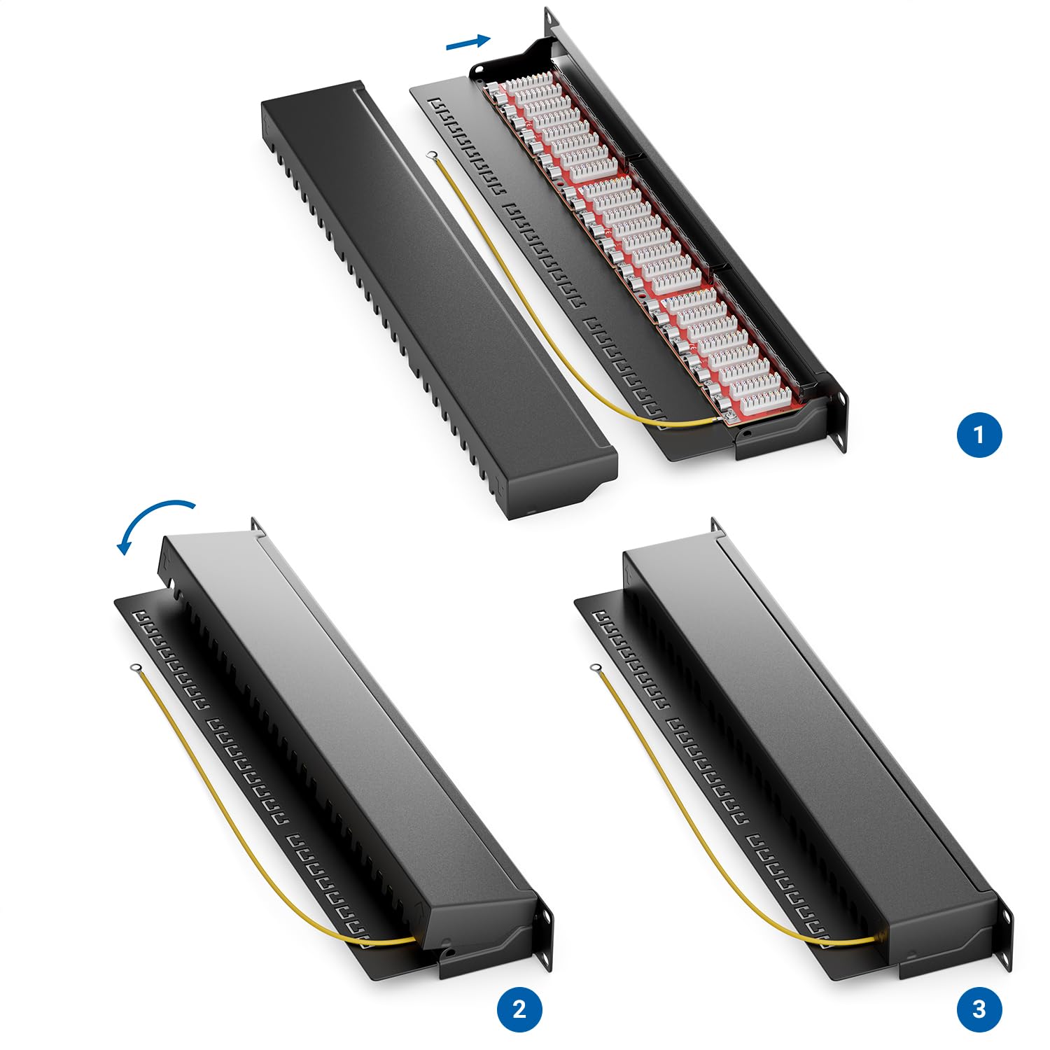 Das vollständig geschirmte Metallgehäuse minimiert elektromagnetische Störeinflüsse von aussen und sorgt so für eine stabile, fehlerfreie Signalübertragung. Die Erdung wird über das vormontierte Erdungskabel realisiert, welches direkt mit dem Potenzialausgleich des Serverschranks verbunden wird, um die Betriebssicherheit zu gewährleisten.