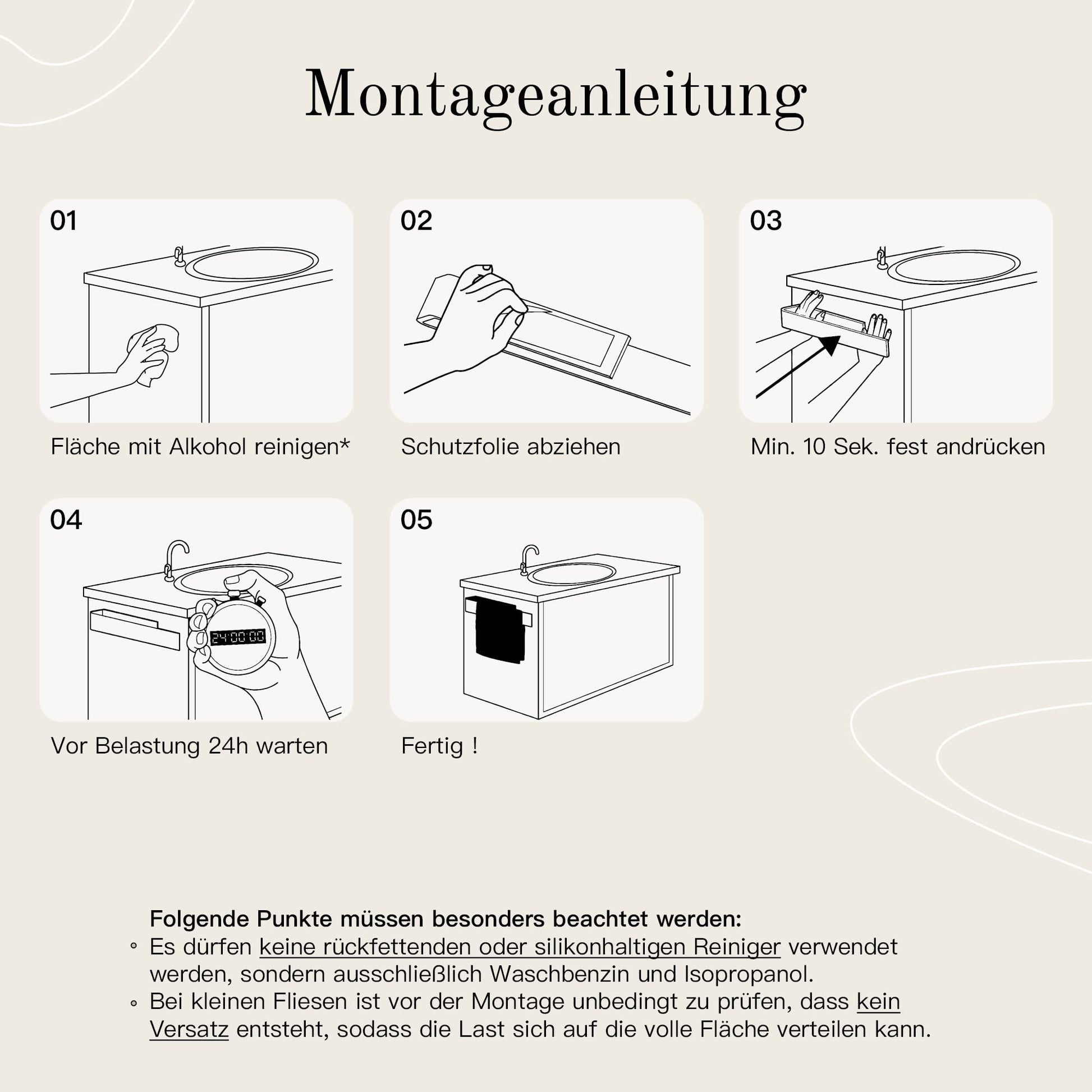 Die Montage selbst ist kinderleicht: Schutzfolie abziehen, Halter fest andrücken – fertig. Um die volle Haftkraft zu garantieren, empfehlen wir jedoch, nach dem Anbringen mindestens 24 Stunden zu warten, bevor Sie den Halter mit Handtüchern belasten.