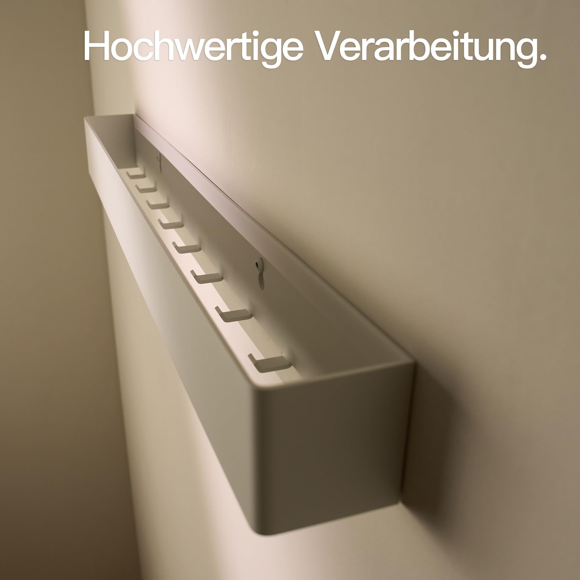 - Integrierte Haken: Die Haken sind dezent in das Design eingelassen und bleiben bei Nichtgebrauch verborgen, was die cleane Optik unterstreicht.