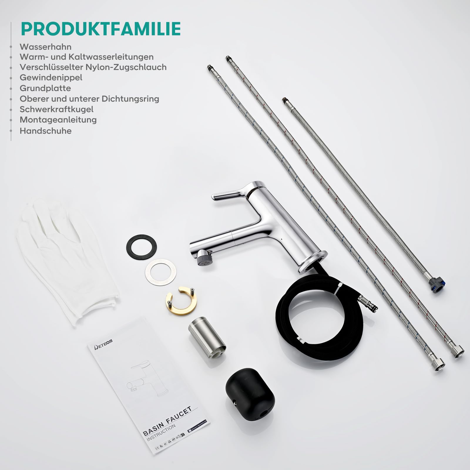 Die Installation ist dank des standardisierten Designs und der 50 cm langen, flexiblen Anschlussschläuche schnell und unkompliziert. Jede Armatur wird vor dem Verpacken zu 100 % geprüft, um Ihnen eine zuverlässige Qualität und jahrelange Freude zu garantieren.