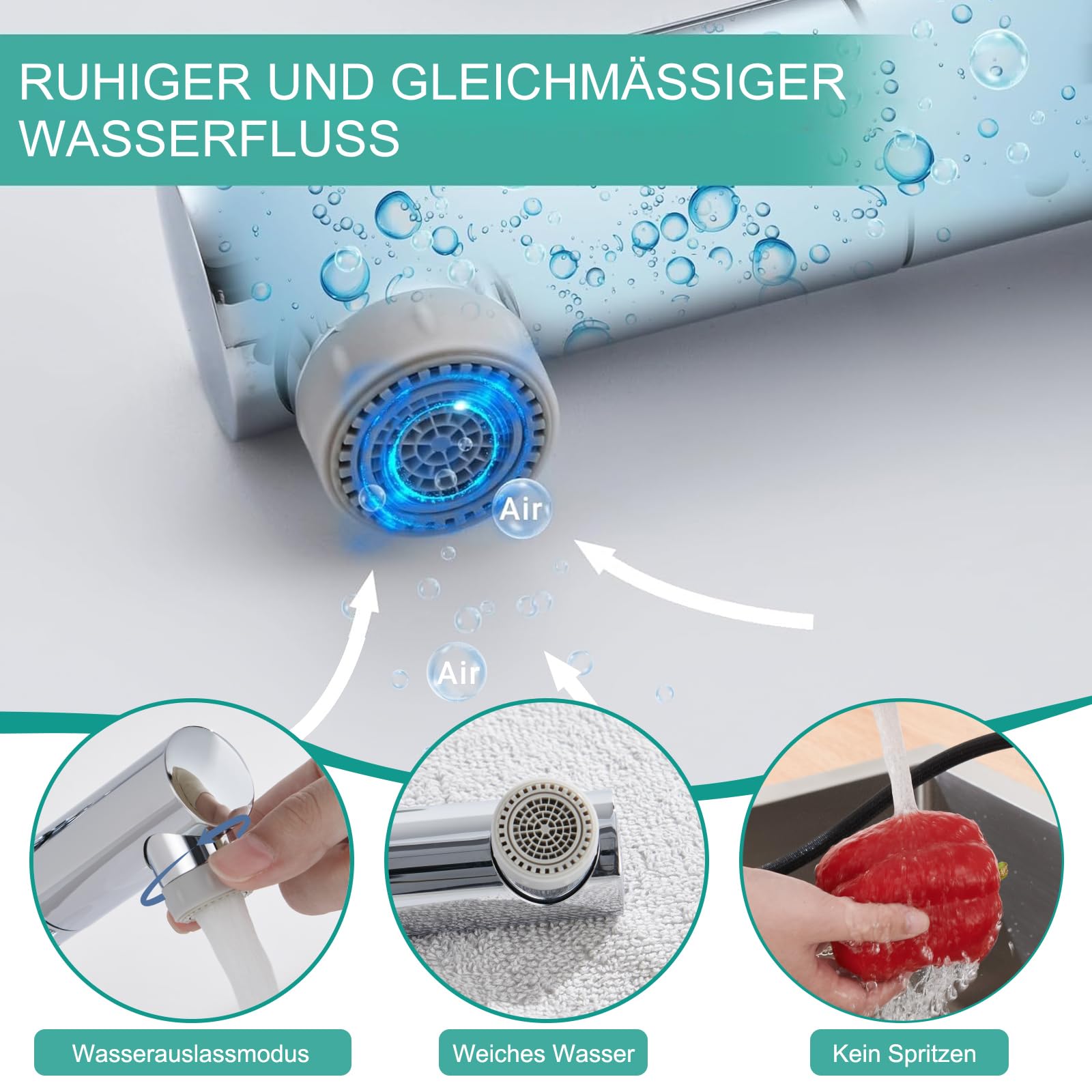 - Abnehmbarer Luftsprudler: Mischt dem Wasser Luft bei für einen weichen, spritzfreien und geräuscharmen Wasserfluss, der zugleich den Wasserverbrauch senkt.