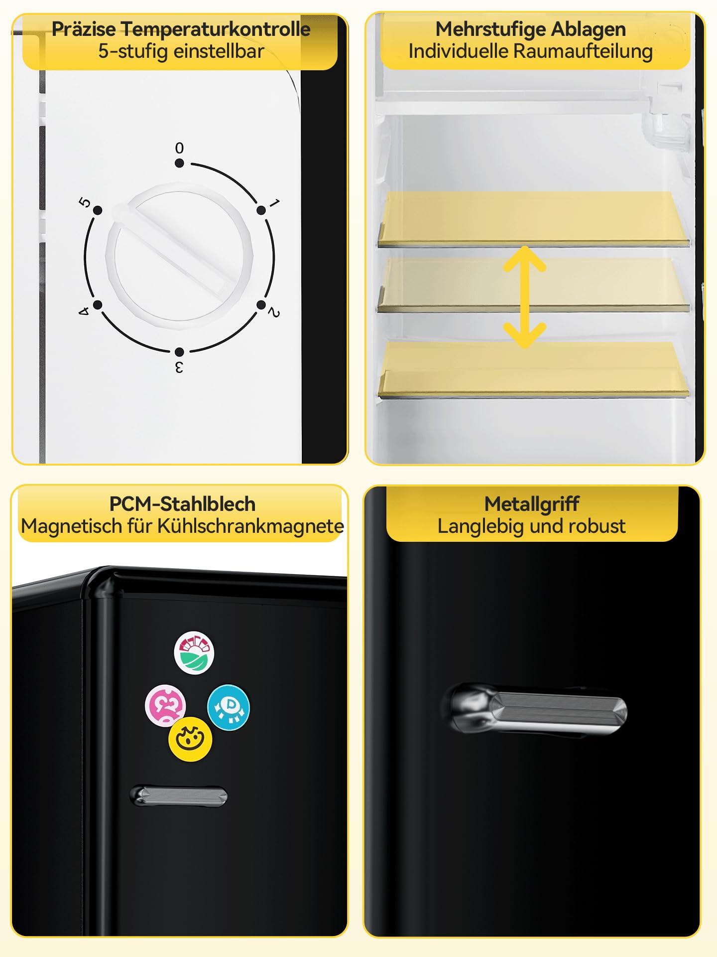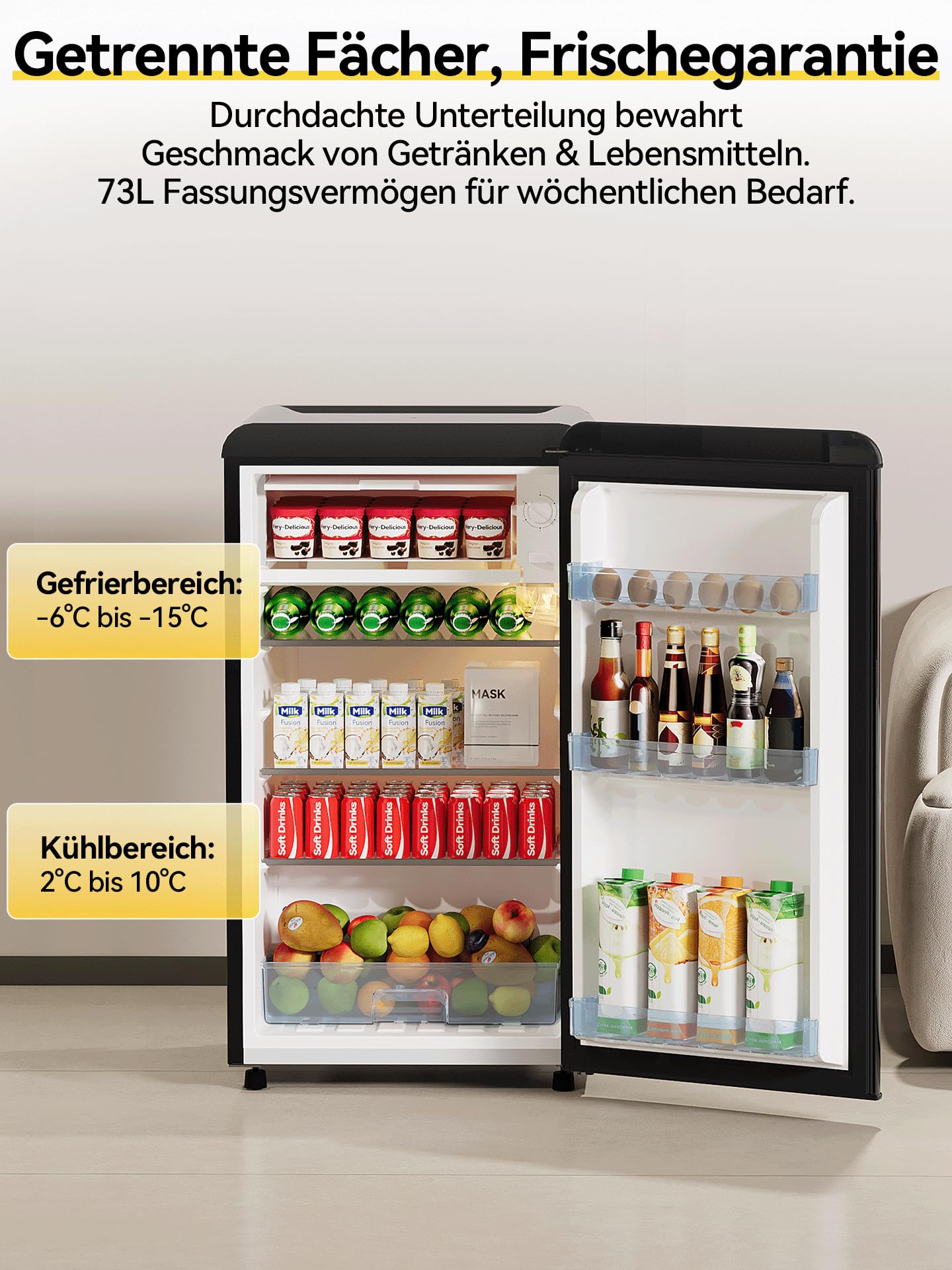 Mit seiner Gesamtkapazität von 75 Litern ist dieser Kühlschrank die ideale Lösung für Singles, Studenten oder als stilvolles Zweitgerät im Büro. Sein kompaktes Design macht ihn perfekt für kleine Küchen und Räume mit begrenztem Platz.