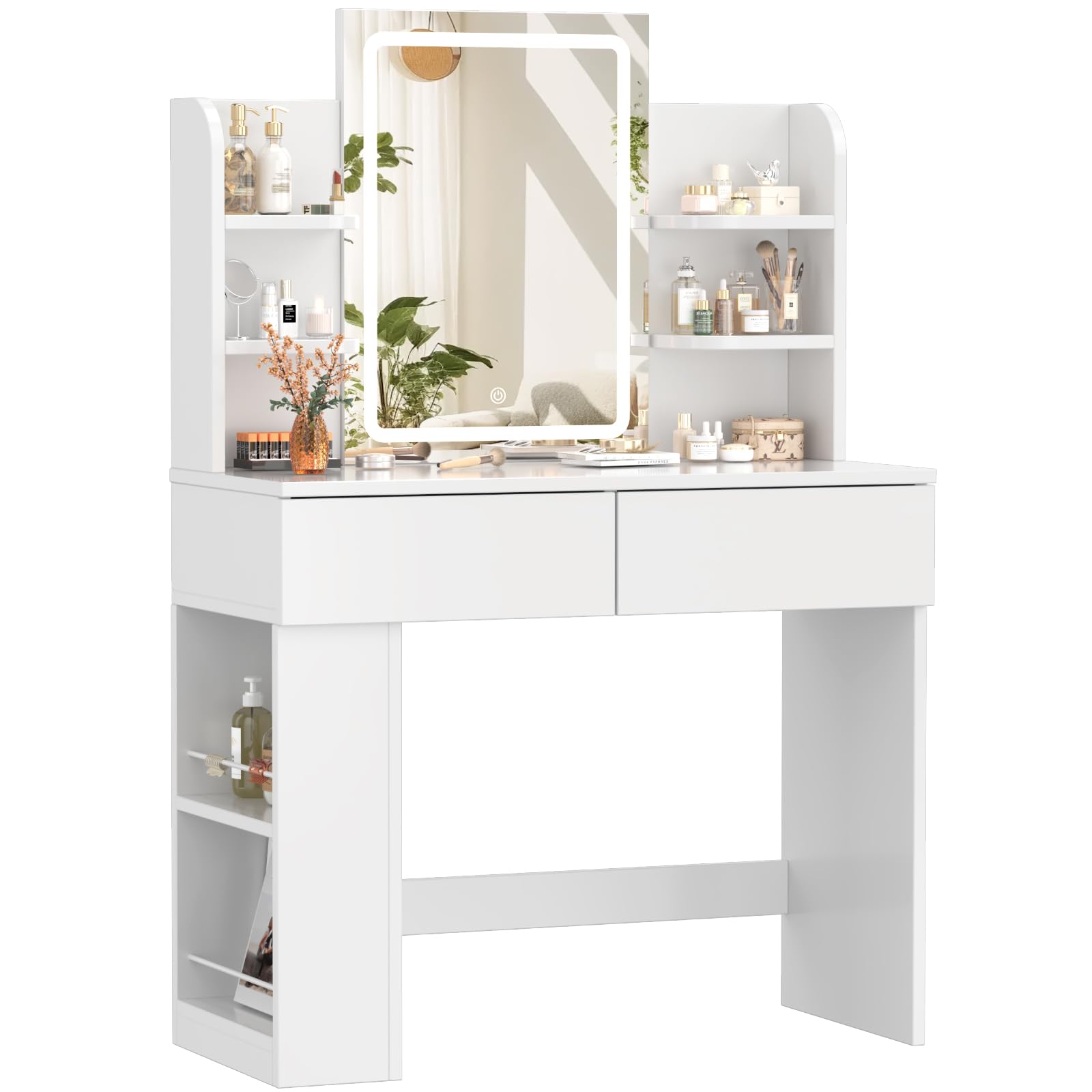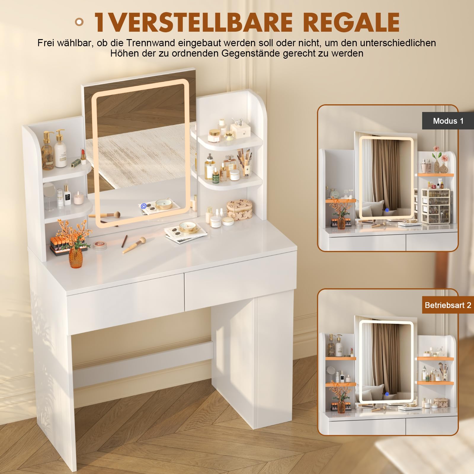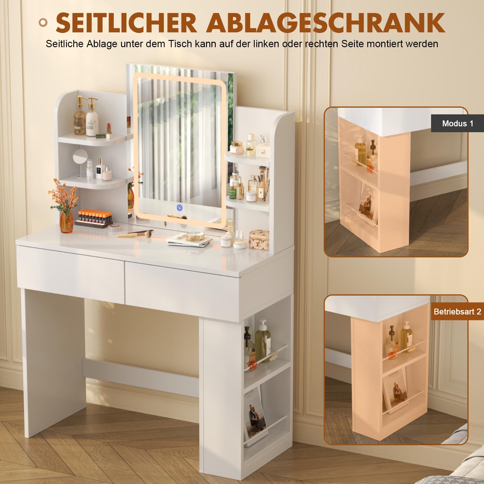 Devoko Schminktisch mit LED Spiegel, weiss – 2 Schubladen, 4 Ablagen
