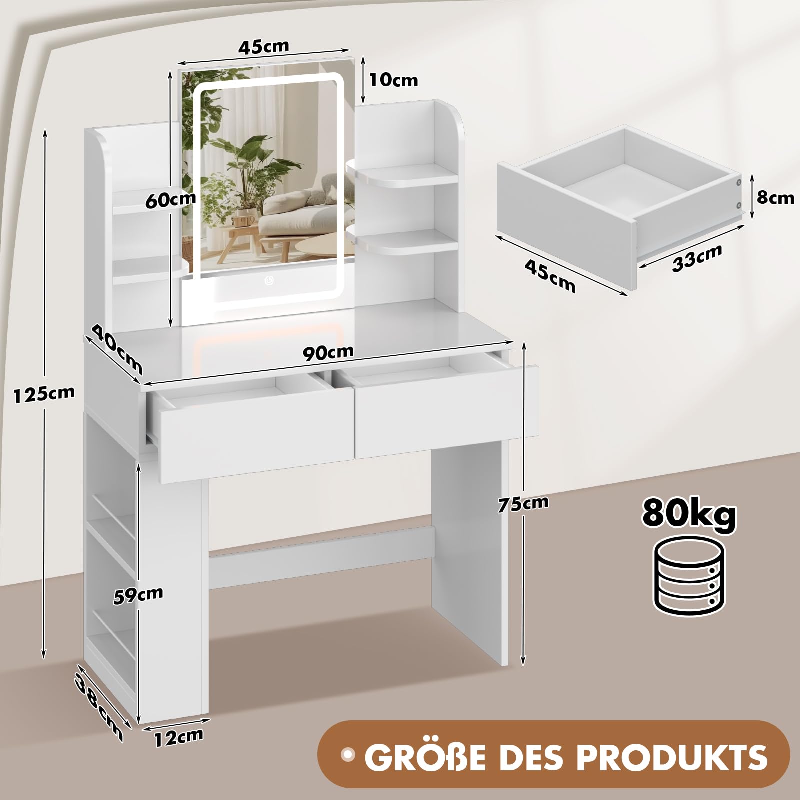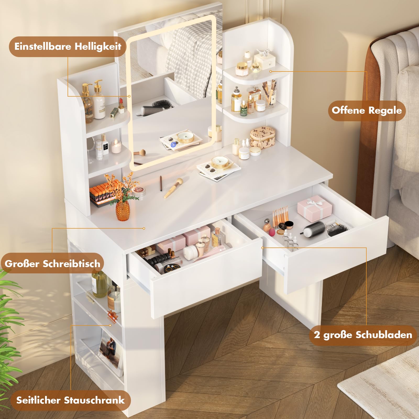 Der Tisch bietet ein durchdachtes Aufbewahrungssystem, um Chaos zu vermeiden. Er hat 2 grosse Schubladen für Kosmetika, 4 offene Ablagefächer für häufig genutzte Artikel wie Parfums und 2 seitliche Trennwände für Kleinteile wie Haargummis oder Wattepads.