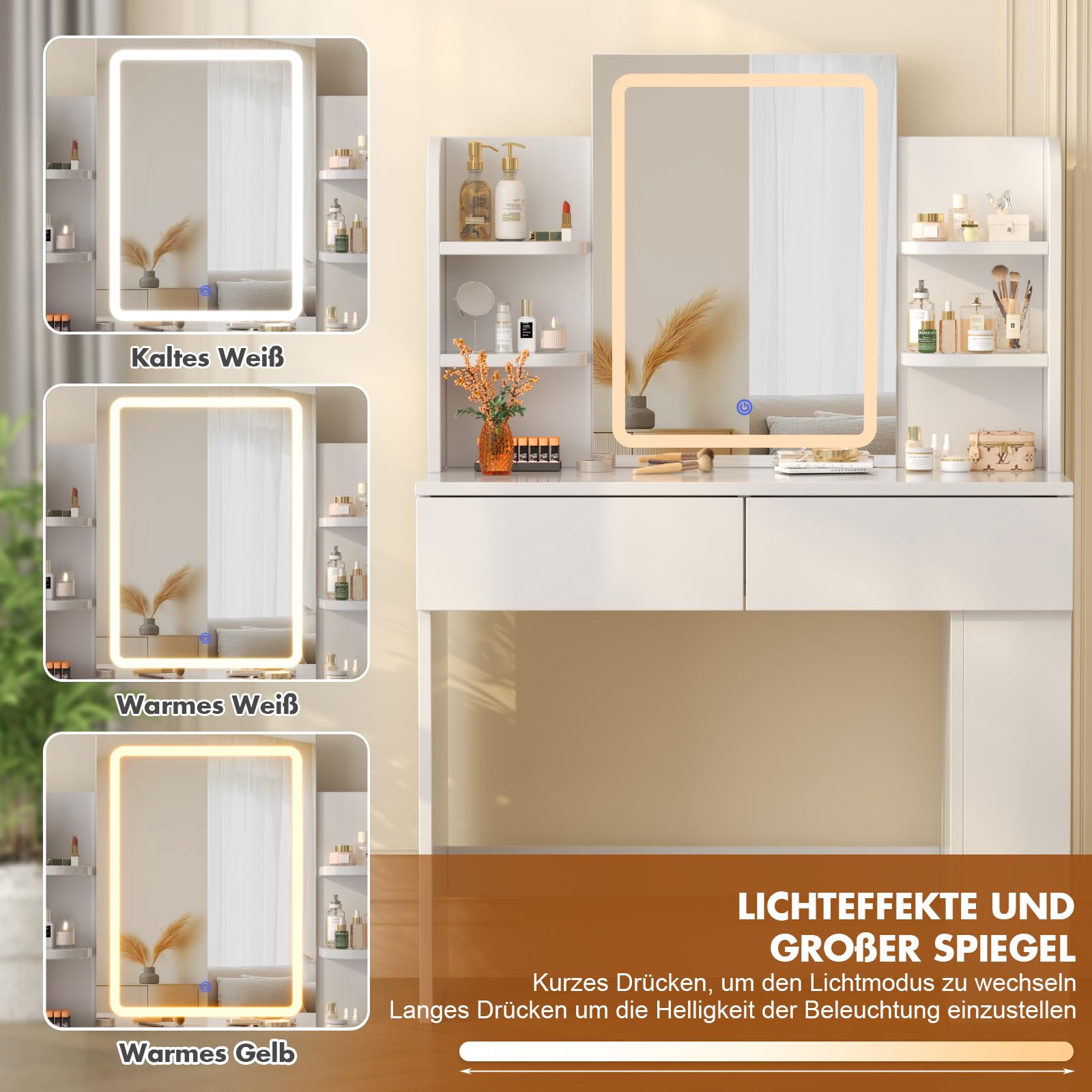 Der integrierte LED-Spiegel verfügt über 3 verschiedene Farbtemperaturen, von Warmlicht bis Kaltweiss. Zudem ist die Helligkeit stufenlos dimmbar, sodass Sie für jede Situation, ob Tages- oder Abend-Make-up, immer die perfekte Ausleuchtung finden.
