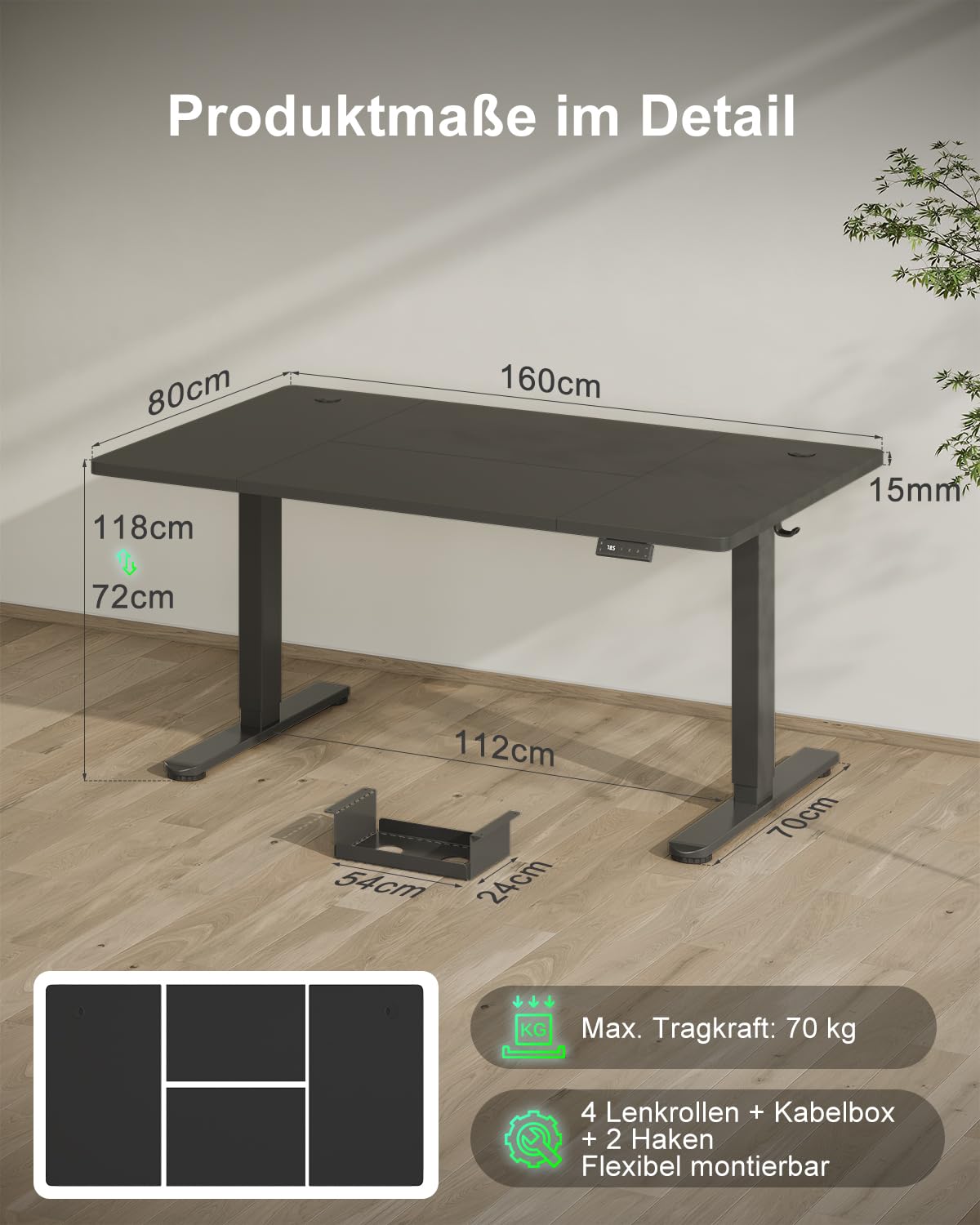 - Elektrische Höhenverstellung: Stufenlos verstellbar von 72 cm bis 118 cm, mit drei programmierbaren Speicherplätzen für Ihre bevorzugten Höhen.
