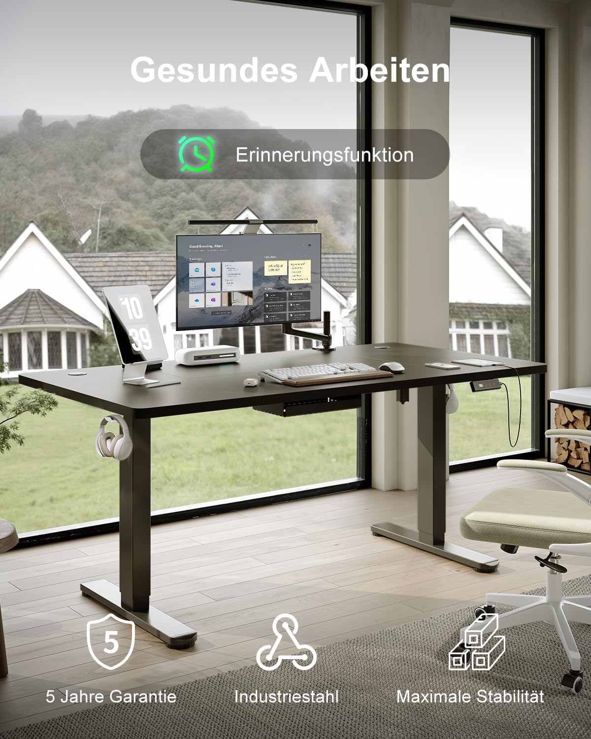Die breite Tischplatte und die hohe Tragfähigkeit von bis zu 80 kg (statisch) ermöglichen es Ihnen, Ihren Arbeitsplatz ohne Kompromisse einzurichten. Der stabile Rahmen gewährleistet auch bei voller Auslastung einen wackelfreien Stand. Mit der mitgelieferten Kabelmanagement-Ablage und dem Typ-C Ladeanschluss halten Sie Ihren Arbeitsbereich stets aufgeräumt und Ihre Geräte einsatzbereit.