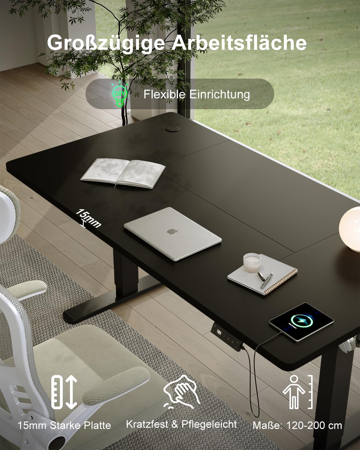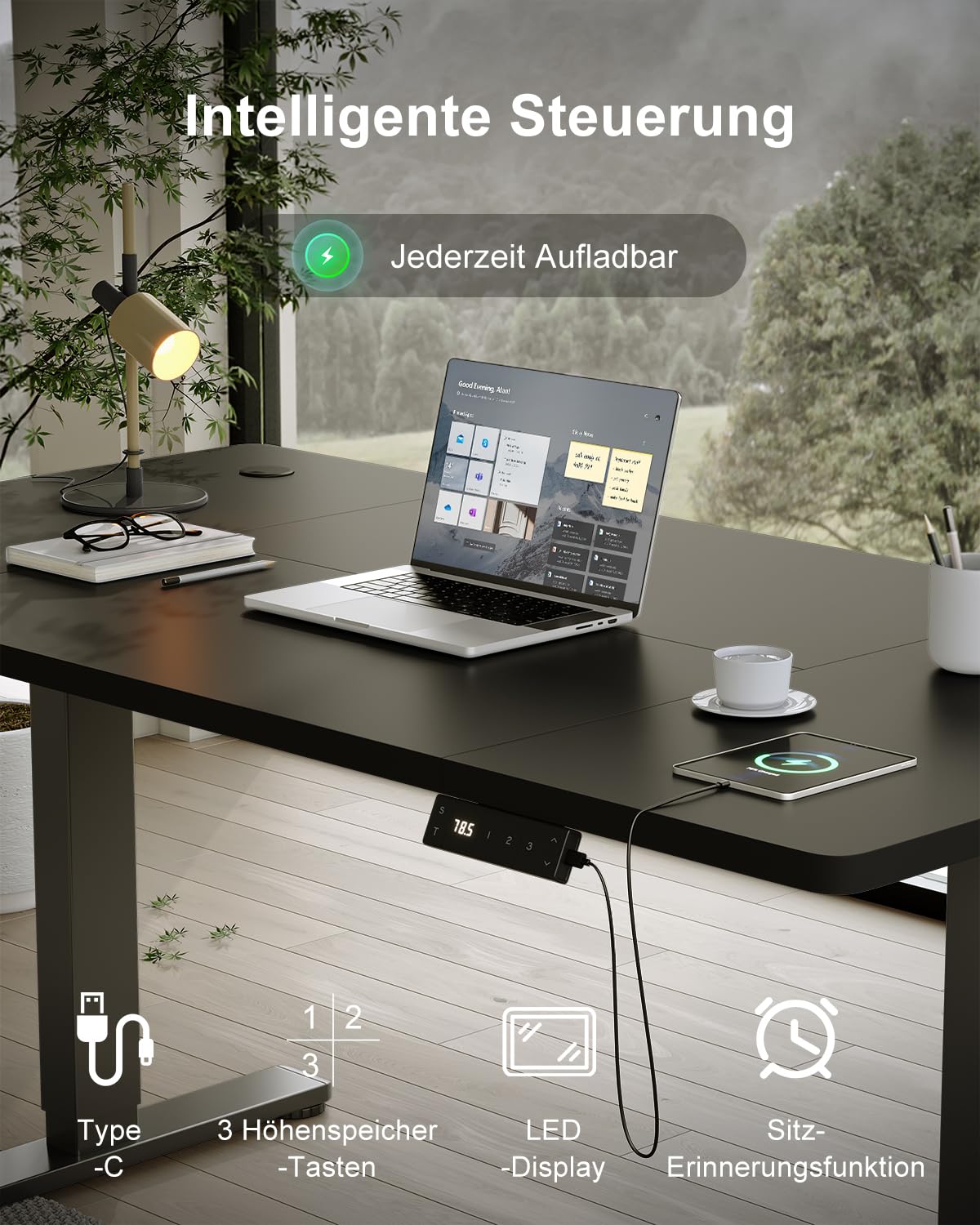 Der Schreibtisch verfügt über einen sehr leisen Motor (unter 45 dB), ein sensibles Antikollisionssystem zur Sicherheit und einen praktischen USB Typ-C Ladeanschluss direkt im Bedienelement. Eine mitgelieferte Kabelmanagement-Ablage sorgt zusätzlich für Ordnung.