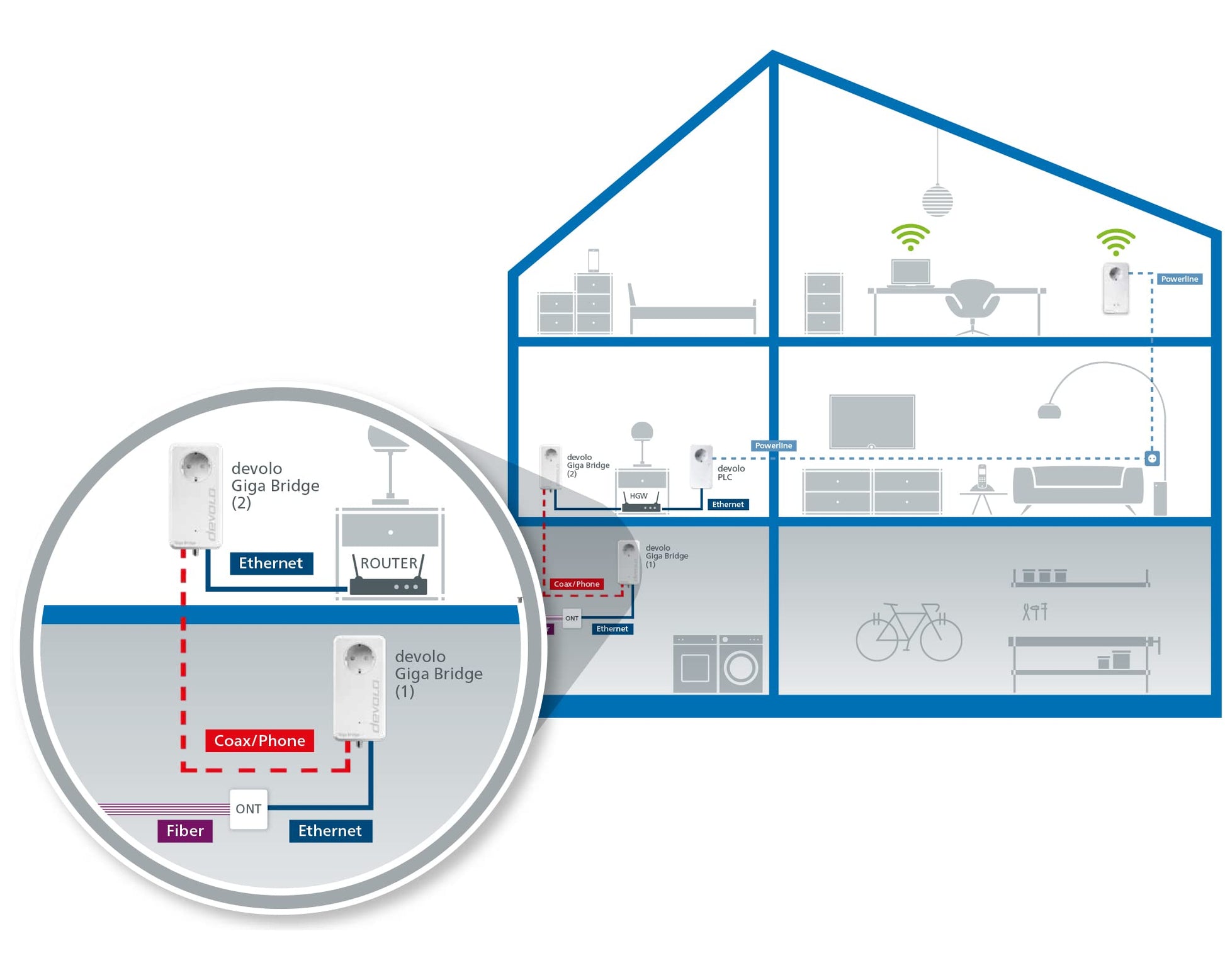 Mit dem devolo Giga Bridge Telefon-Set bringen Sie die volle Leistung Ihres Glasfaseranschlusses dorthin, wo sie gebraucht wird: direkt zu Ihrem Router. Diese intelligente Lösung nutzt Ihre vorhandene Telefonverkabelung im Haus, um das High-Speed-Signal ohne aufwendiges Bohren oder neue Kabel zu übertragen.