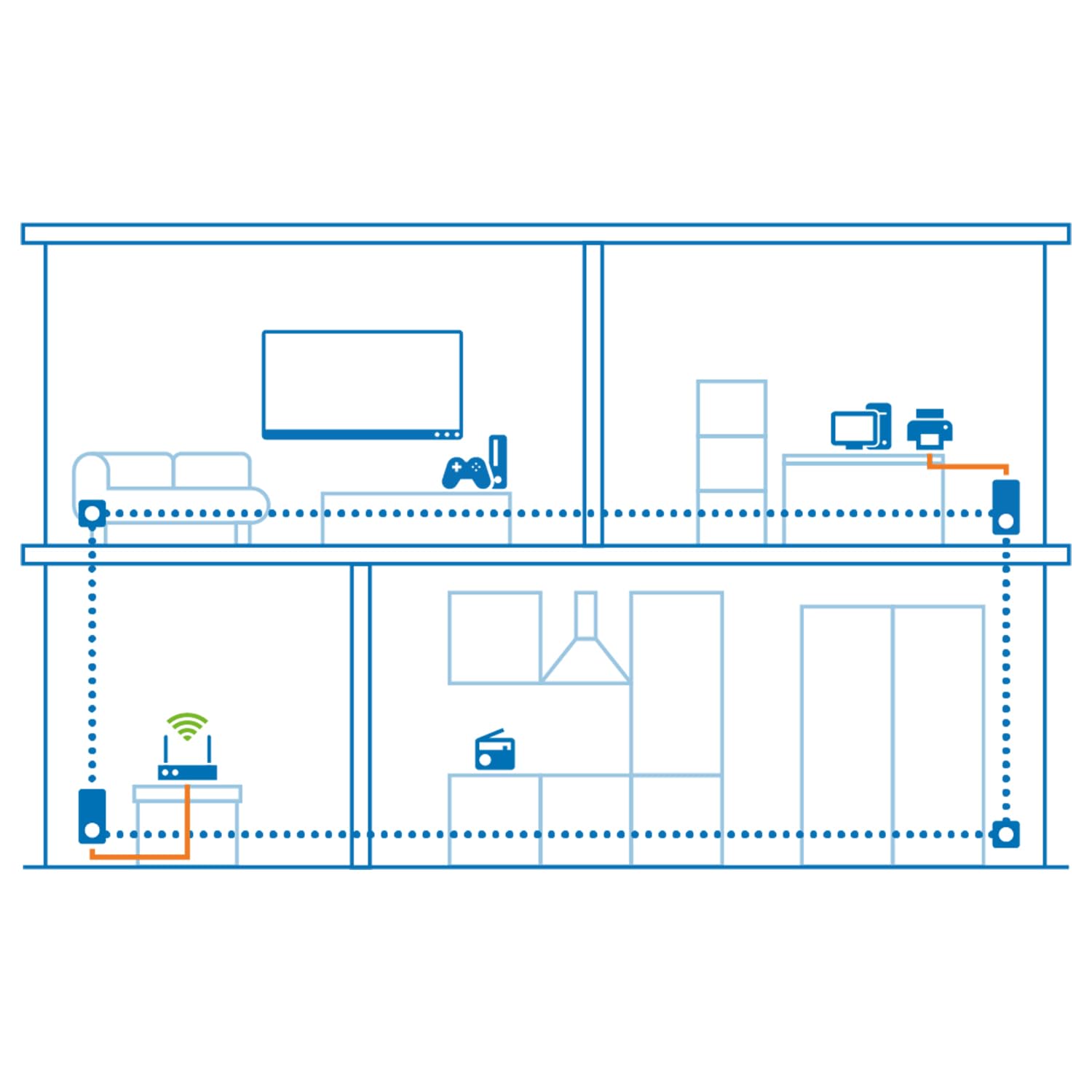 Die Technologie nutzt die vorhandene Stromleitung in Ihrem Zuhause, um das Internetsignal zu übertragen. Dadurch werden Hindernisse wie dicke Wände oder Decken, die ein WLAN-Signal oft schwächen, mühelos überwunden. Die maximale Reichweite über die Stromleitung beträgt dabei bis zu 400 Meter, wodurch eine stabile Verbindung auch in weit entfernten Räumen sichergestellt wird.